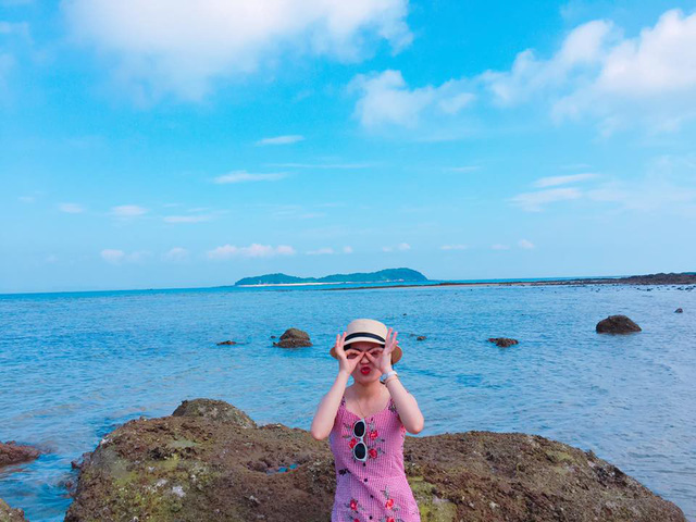 Thời gian ra tới Cô tô con chỉ khoảng 15 phút, Trang và nhóm bạn dành thời gian khám phá nơi đây trong 2 tiếng. Theo Trang, Cô tô con khá hoang sơ, có bãi biển đẹp, bờ cát trắng mịn hút tầm mắt và bãi đá rêu xanh đẹp nao lòng. Dọc bờ biển có rất nhiều vỏ sò ốc đủ hình cho các bạn chụp ảnh, ngắm cảnh.