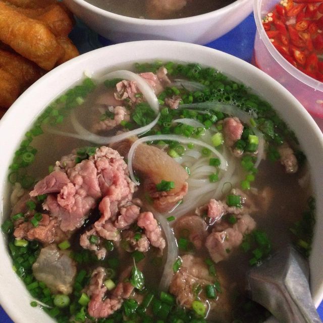 Nhiều người chắc hẳn vẫn thắc mắc rằng sao phở bò thôi mà đắt thế. Này nhé, “đắt xắt ra miếng” cơ mà. Sao mà quên được bát phở nơi đây với thịt lõi ngon đến thế, miếng nào cũng quắn lại như miếng tai lợn, nâu hồng chấm gân trắng, giòn mà mềm, ngọt lịm. Thịt chín thơm thế, miếng nào vẫn ra miếng ấy, đồ sộ trong nồi, nhưng khi ăn thì tan trong miệng, nồng nàn, ấm áp. Thịt gân đủ mềm, mà vẫn đủ giòn, ăn sướng miệng phải biết.
