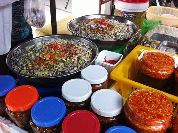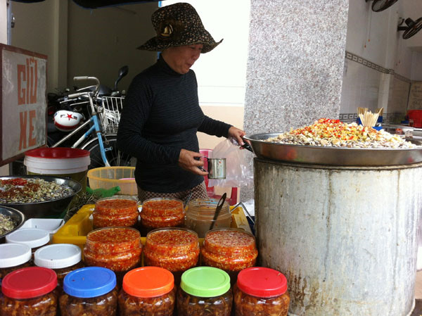 Một trong những món được chế biến từ ốc ruốc được nhiều người yêu thích đó là trộn cay. Để giữ được độ ngon ngọt, người ta hong ốc trên bếp, rải sả, ít muối ớt, tiêu vào cho ốc được thấm tháp. Sau đó, từ những thau ốc to này, khi khách đến mua, các chị chủ hàng bắt đầu trộn các loại gia vị như dầu phi hành khô, muối, ớt, bột ngọt và đặc biệt là nước mắm gừng vào, đảo nhanh tay. Rồi gói ghém lại kèm với một ít gai bưởi để chuẩn bị sẵn để cho khách lể.