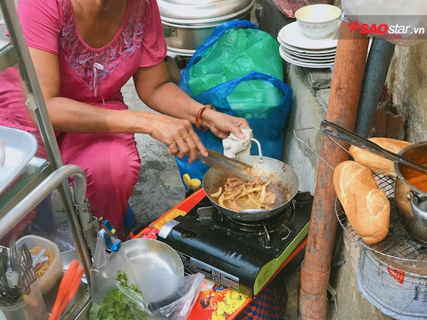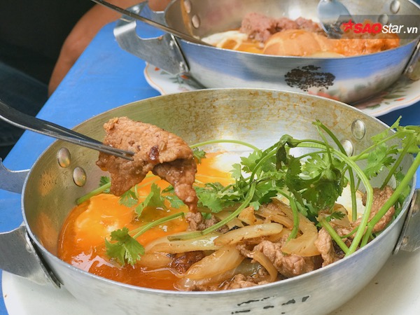 Ở đây còn có cả bò, những lát bò mỏng được xào cùng với hành tây thơm phức sẽ giúp cho bữa sáng đầy đủ năng lượng và no nê. Tuy là quán lề đường nhưng không hề thiếu đĩa dưa leo, củ cải ngâm chua để tăng thêm độ giòn cho khuôn miệng.