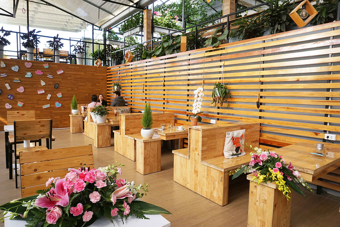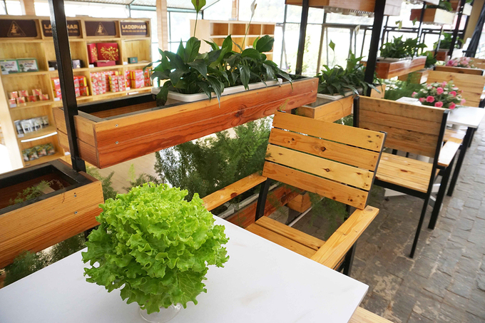 Trên mỗi bàn cho khách đều bày trí một loại hoa hoặc rau, trồng trong các loại chậu có chất liệu nhẹ, gần gũi với thiên nhiên. Điều này giúp du khách như được thưởng thức cà phê trong không gian một trang trại rau, hoa ở Đà Lạt.