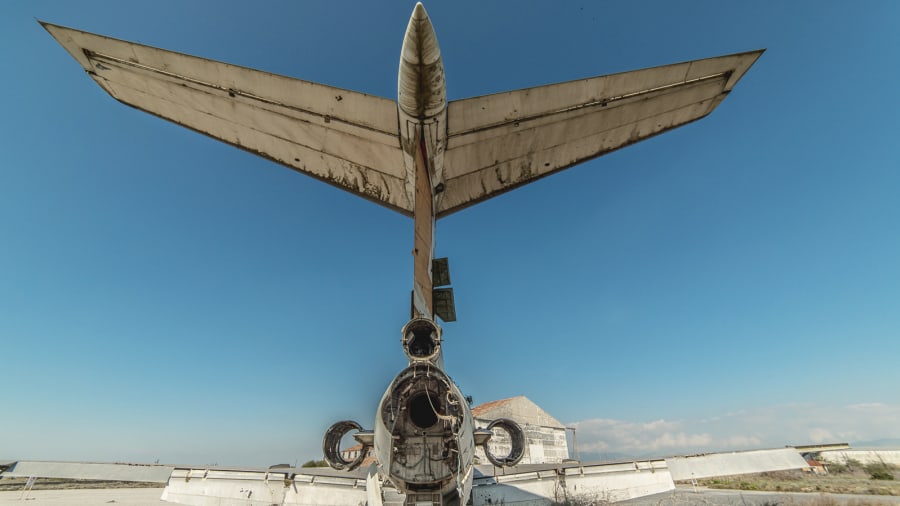 Một chiếc máy bay phản lực nằm im lìm ngoài trời bên cạnh một ngôi nhà bỏ hoang. Chiếc máy bay này sẽ không thể hoạt động trở lại vì phần động cơ của nó đã bị hỏng và phần cánh bị oxy hóa theo thời gian.