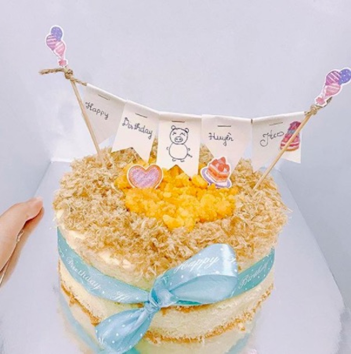 Bông lan trứng muối từ lâu nổi tiếng là món ăn vặt “thần thánh” và độ gây nghiện cực kì cao. Do đó, bạn chỉ cần nhờ thợ làm bánh phủ lên mặt bánh những lời chúc, ngày sinh… bằng sốt phô mai thôi. Cốt bánh thì mềm xốp hoà cùng trứng muối mằn mặn quyện đều trong vị beo béo của phô mai đã tạo nên một hương vị bình dân nhưng vô cùng quyến rũ.