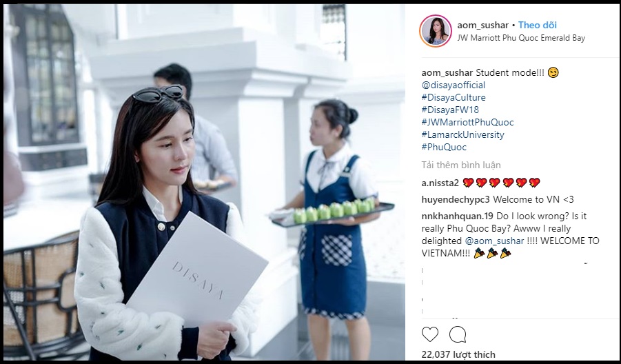 Mới đây, fans hâm mộ Việt của Aom Sushar - nữ diễn viên được mệnh danh là “Song Hye Kyo Thái Lan” - đã vô cùng phấn khích khi thấy thần tượng check in tại Phú Quốc.