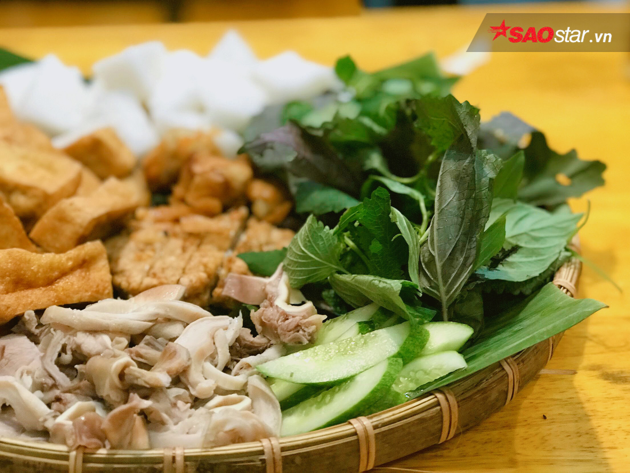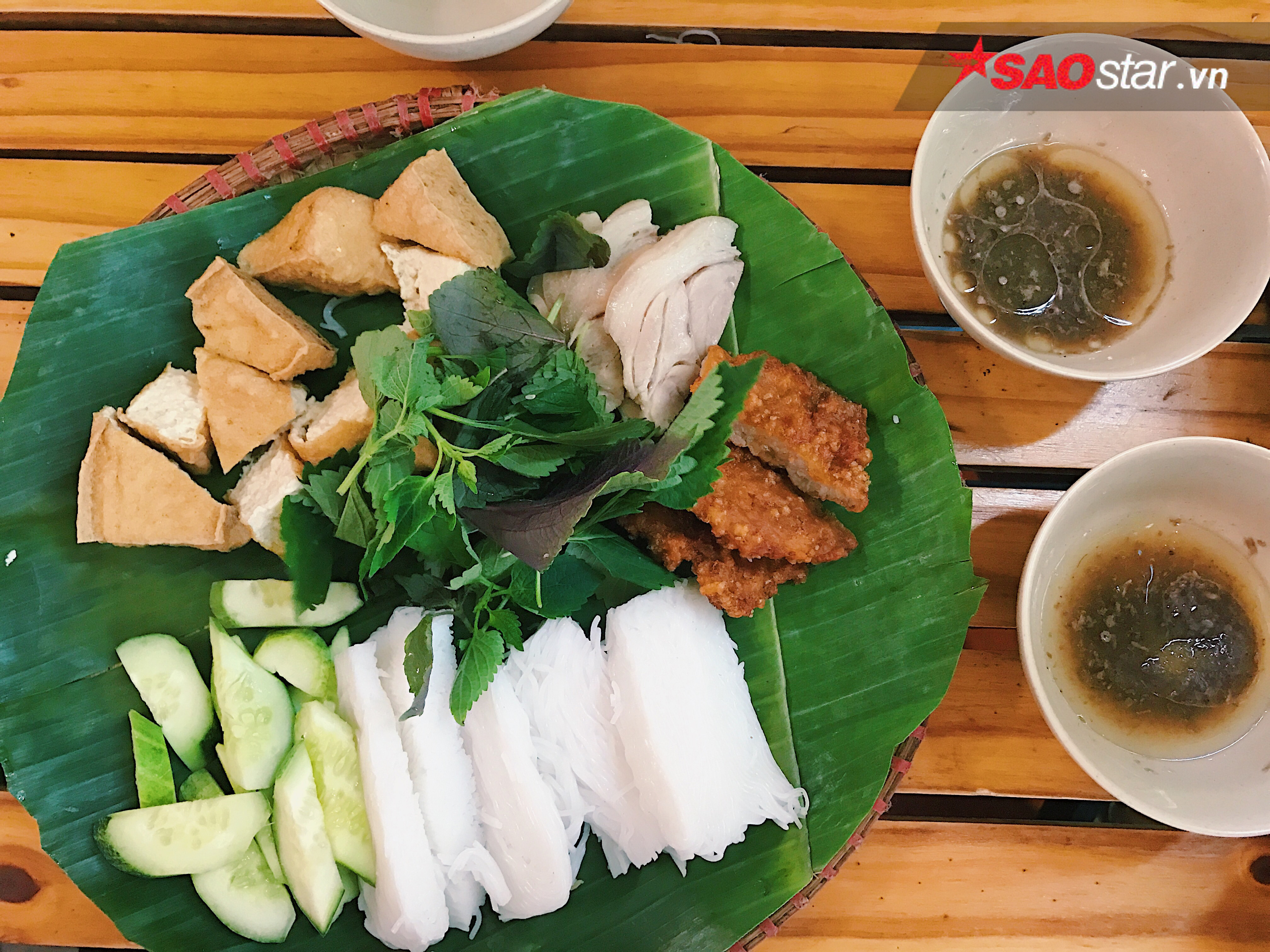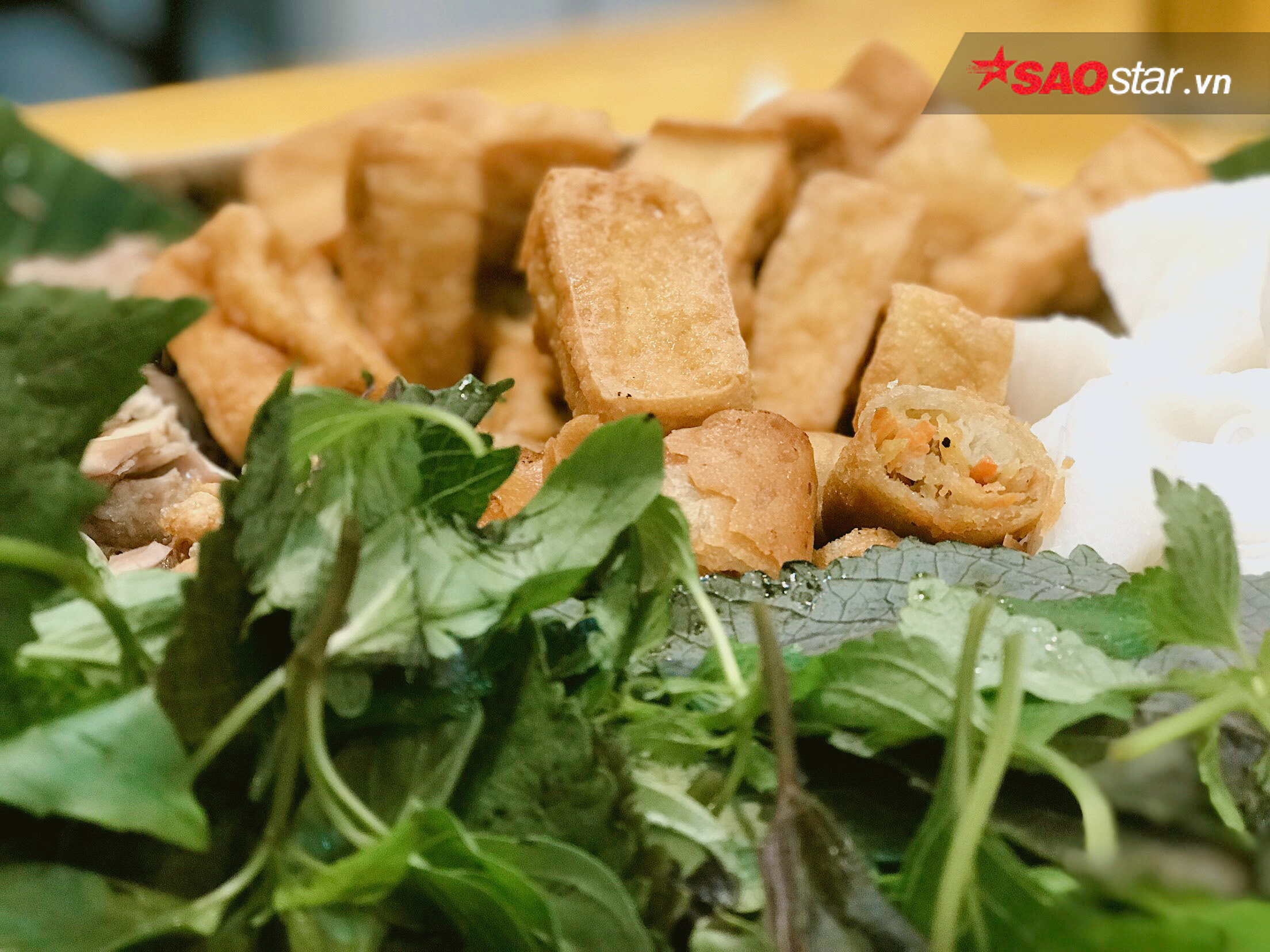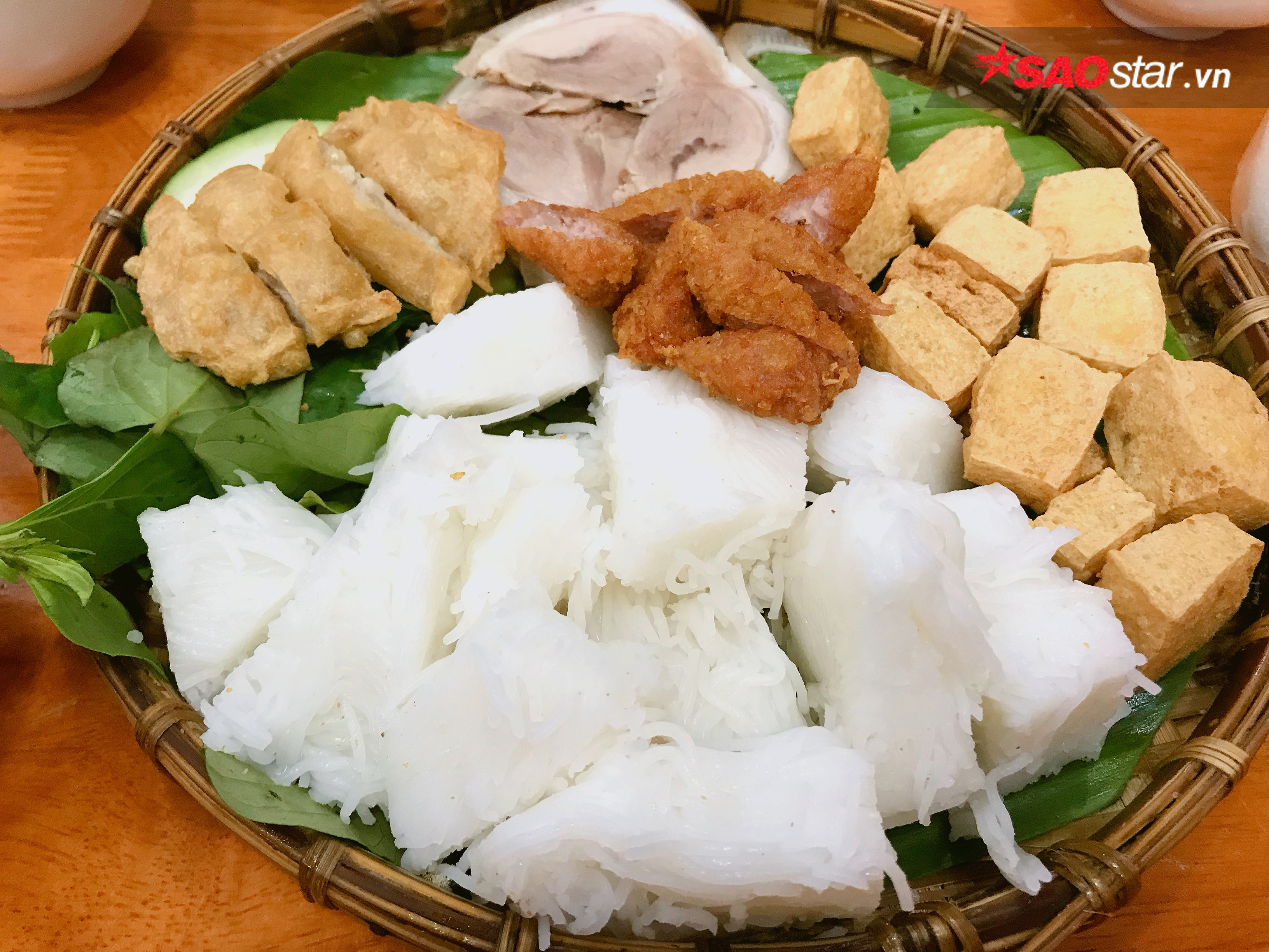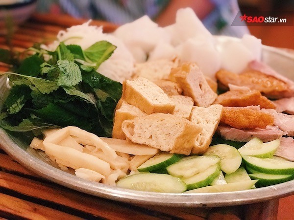 Phần thập cẩm của quán sẽ khiến bạn “phát hoảng” với đầy ắp những món ăn mà có lẽ phải ba bốn người mới ăn hết. Mẹt bún bao gồm đậu chiên, chả cốm, phèo, cuống họng, bao tử, chả giò cùng với thịt heo đa dạng và phong phú hương vị.