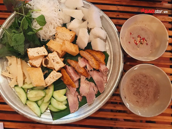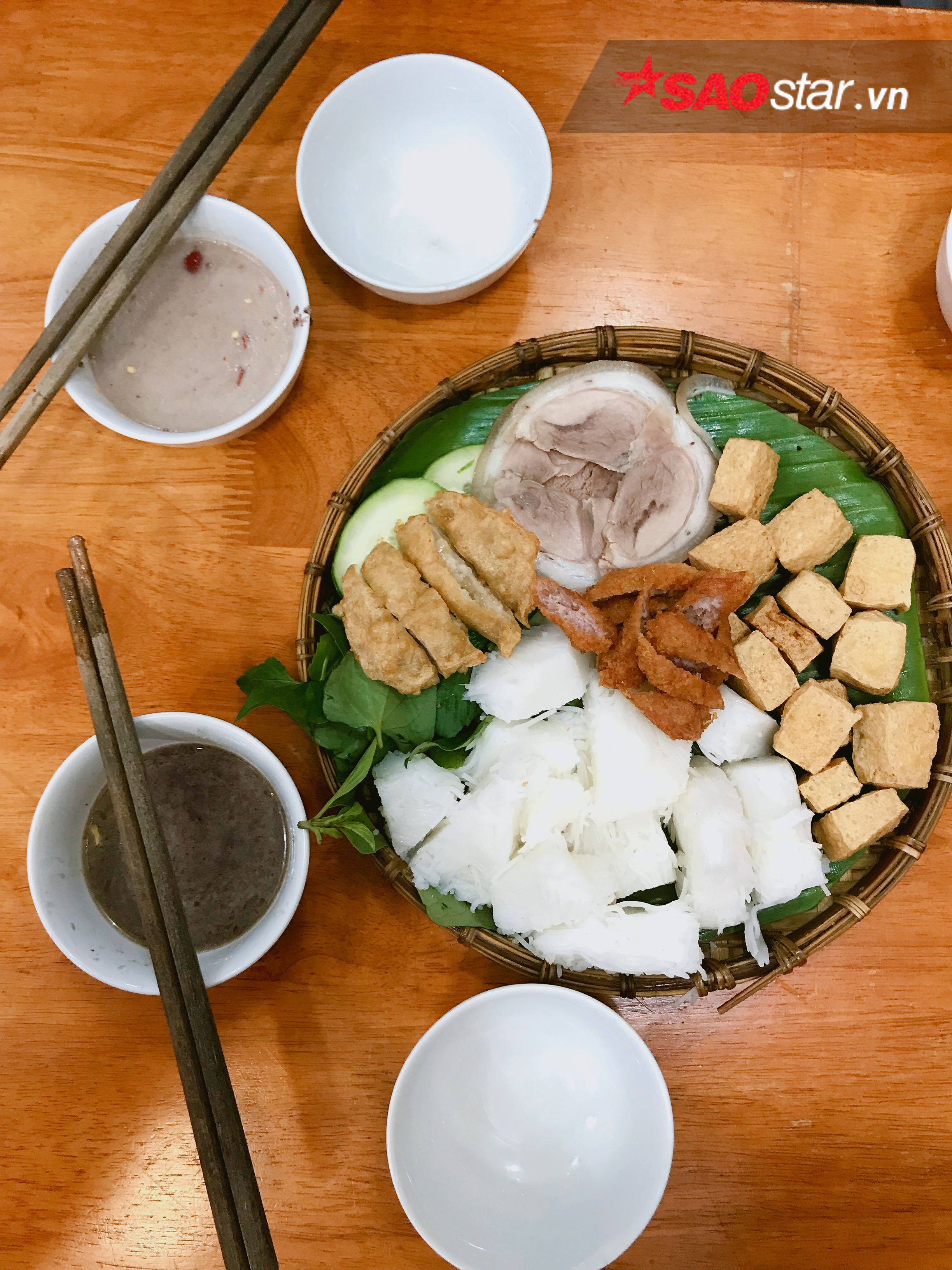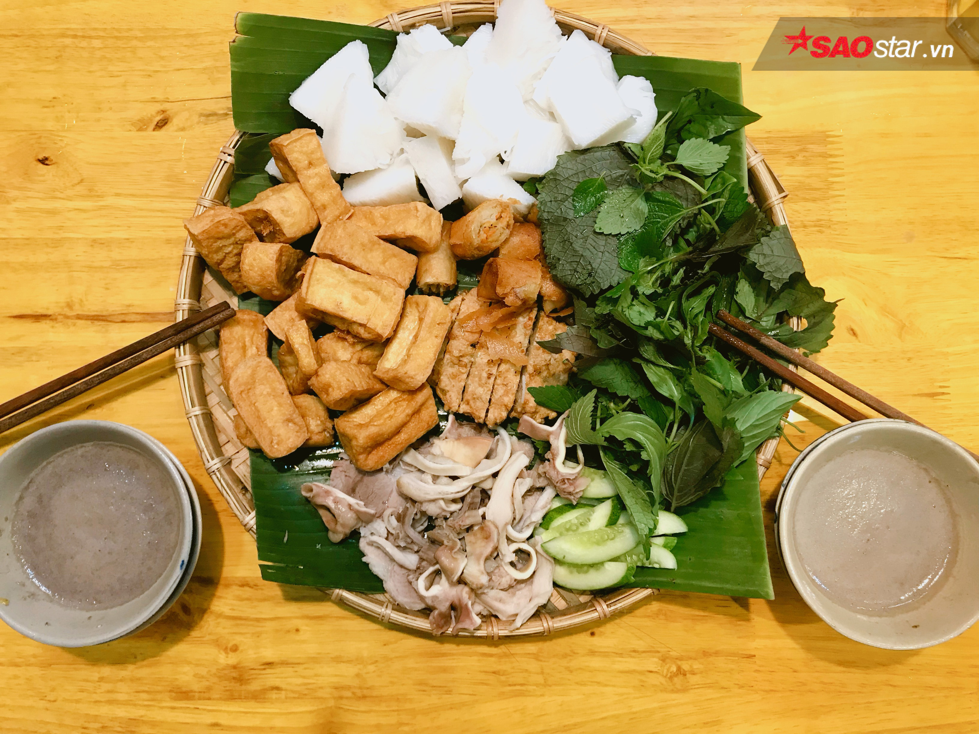 Thành phần chính cho món “bún đậu tá lả” hay còn gọi là thập cẩm ở đây gồm có bún lá, đậu chiên giòn, chả cốm, thịt ba rọi và không thể thiếu chén mắm tôm đậm đà.