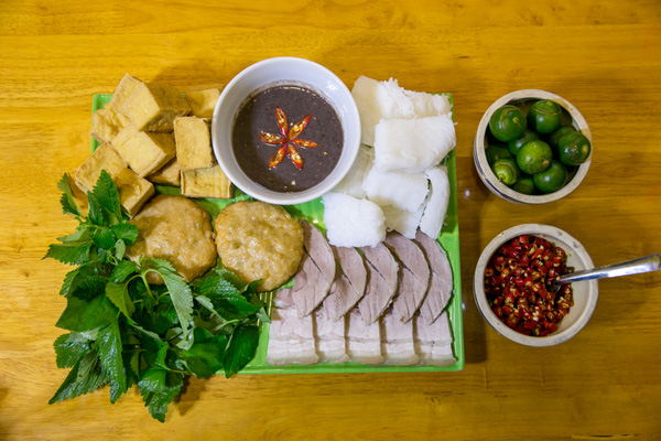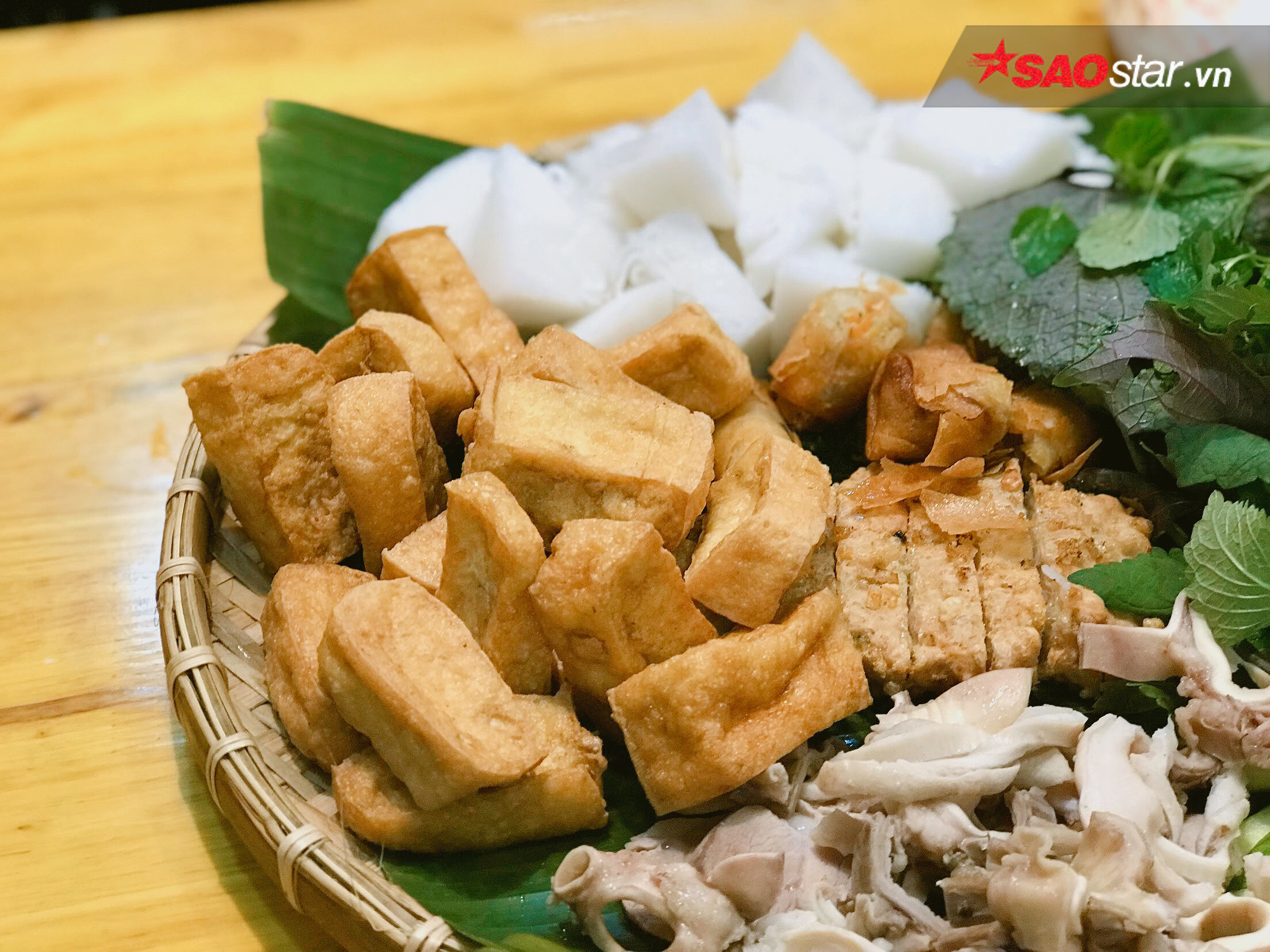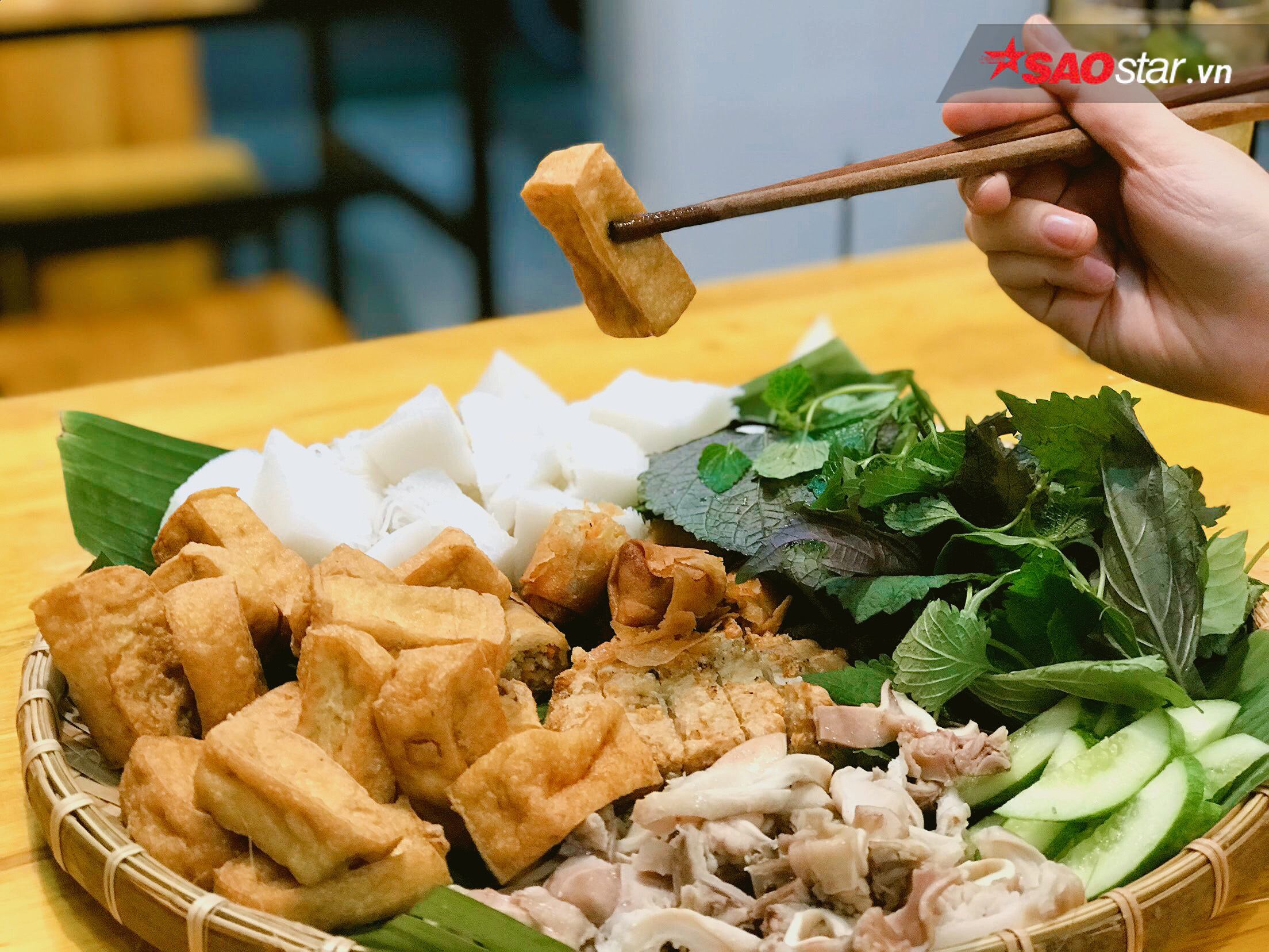 Từng miếng đậu thơm lừng, béo ngậy với lớp vỏ giòn tan nhưng mềm mịn từ bên trong. Chả cốm được chiên căng phồng, vị đậm đà. Thịt chân giò chín tới đủ độ mềm, dai, ngọt. Rau xanh tươi mới. Tất cả được bày trong chiếc mẹt tre lót lá chuối trông vô cùng hấp dẫn, bạn sẽ không khỏi xuýt xoa ngay khi vừa nhìn thấy.