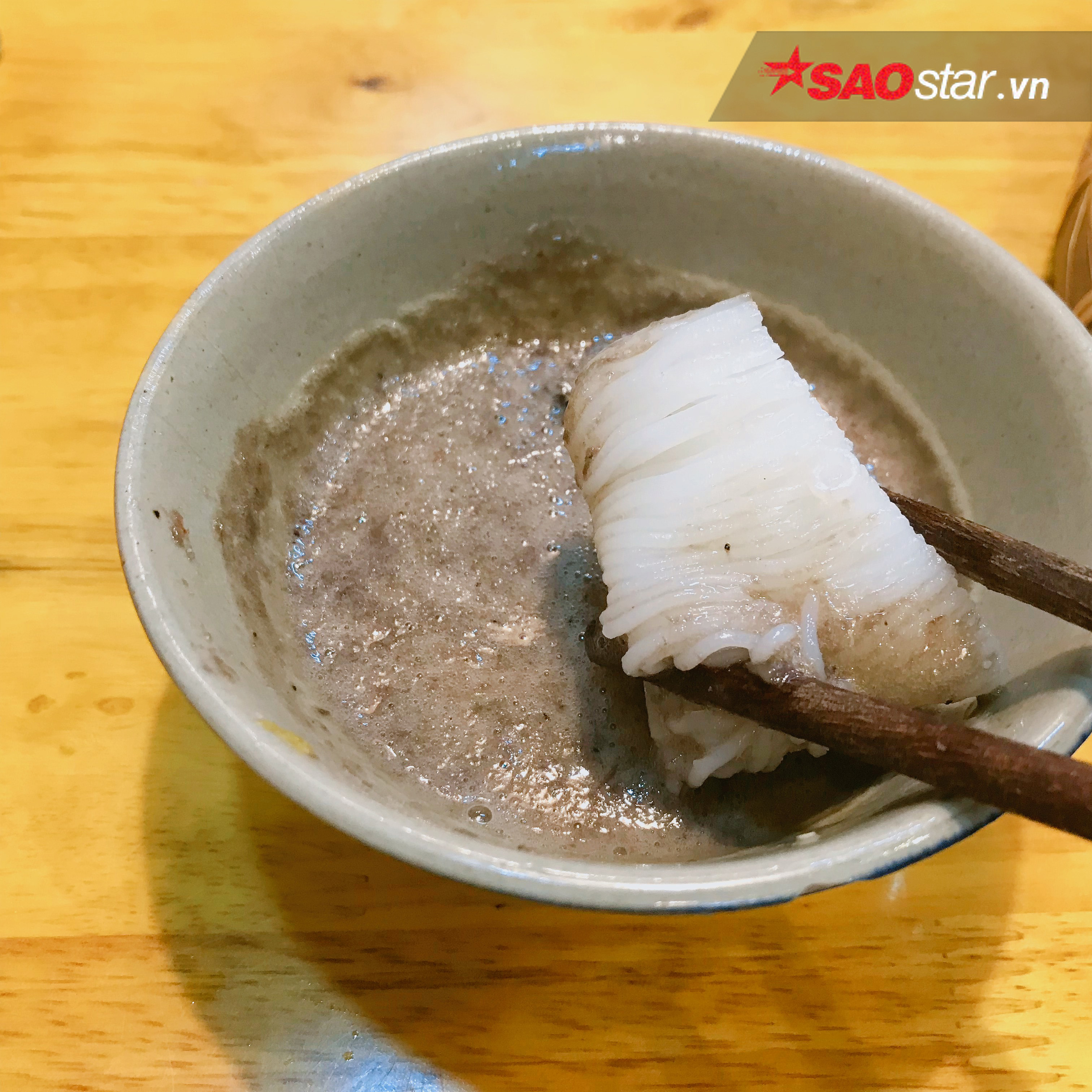 Mắm tôm ở quán có màu hồng nhạt, vị thơm quyến rũ. Mắm múc ra bát sẽ được rưới thêm lớp mỡ rán đậu tạo nên thứ mắm tôm sóng sánh, ngon vô cùng. Khi ăn, bạn vắt chanh, thêm tí ớt rồi đánh cho sủi bọt lên. Dùng đũa gắp một đũa bún, kèm miếng thịt, miếng lòng, miếng đậu và một ít rau thơm rồi chấm ngập vào chén mắm và bắt đầu thưởng thức. Hương vị của món ăn như đánh thức từng giác quan.