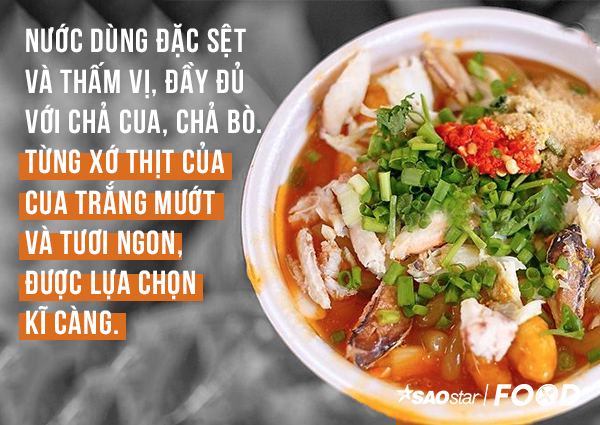 Tô bánh canh đặc biệt được múc ra to ụ với nguyên cả con cua nằm chiễm chệ bên trên. Nước dùng đặc sệt và thấm vị của gạch cua, được bồi thêm nào là chả cua, chả bò đầy đủ. Từng xớ thịt cua trắng mướt và tươi ngon, luôn là nguyên liệu mới nhất được cô chủ lựa chọn kĩ càng.