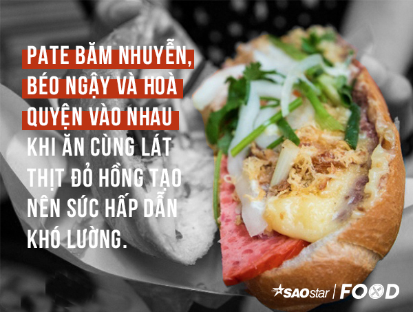 Pate - thịt nguội nằm trong những món làm nên thương hiệu cho ổ bánh nơi đây. Pate băm nhuyễn, béo ngậy và hoà quyện vào nhau khi ăn cùng lát thịt đỏ hồng tạo nên sức hấp dẫn khó lường. Các thành phần khác từ bánh mì, dưa chua,… đều tạo nên một hương vị riêng, làm cho ổ bánh mộc mạc nhưng vẫn toả sáng.