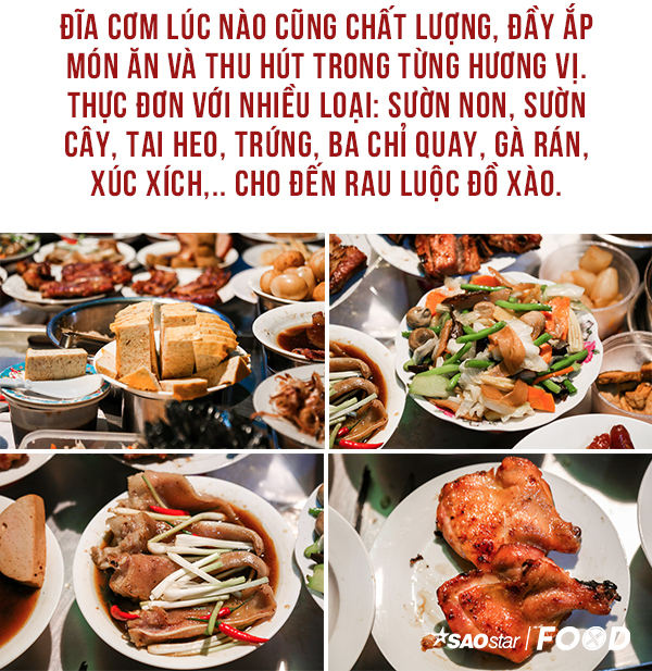 Nhưng nghịch lí là tiệm cơm vẫn không bao giờ ngớt khách, thậm chí có người còn cất công đi xa để thưởng thức phần cơm tấm “sang chảnh” nhất này. Cũng đúng thôi, thức ăn ở đây ngập tràn với đủ loại từ sườn non, sườn cây, tai heo, trứng, ba chỉ quay, gà rán, xúc xích,… cho đến rau luộc, đồ xào vô cùng phong phú. Tất cả đều do gia đình chủ quán chế biến mỗi ngày để luôn tươi mới.