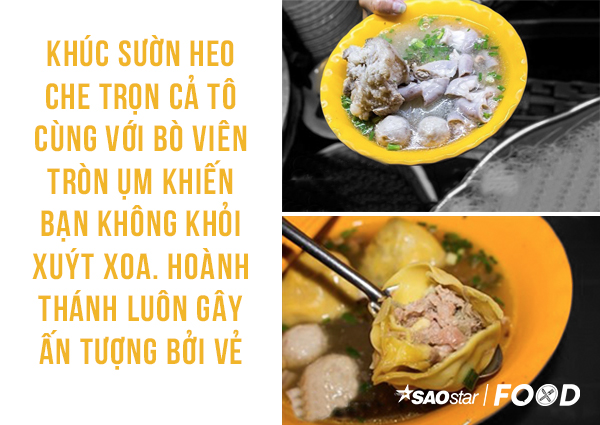 Đặc biệt, những viên hoành thánh luôn gây ấn tượng với những ai lần đầu tiên đến quán, bởi vì vẻ ngoài “ngoại cỡ” của chúng. Lớp da bên ngoài vàng tươi và dày dặn, gói gém kĩ phần nhân thịt bên trong được nêm nếm vừa miệng.