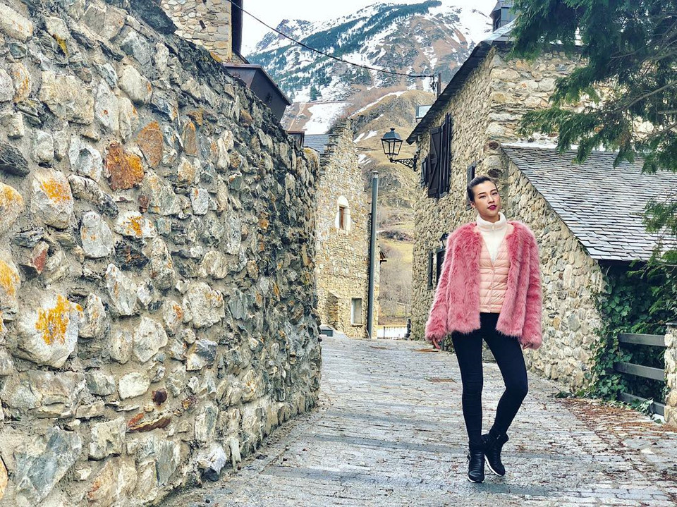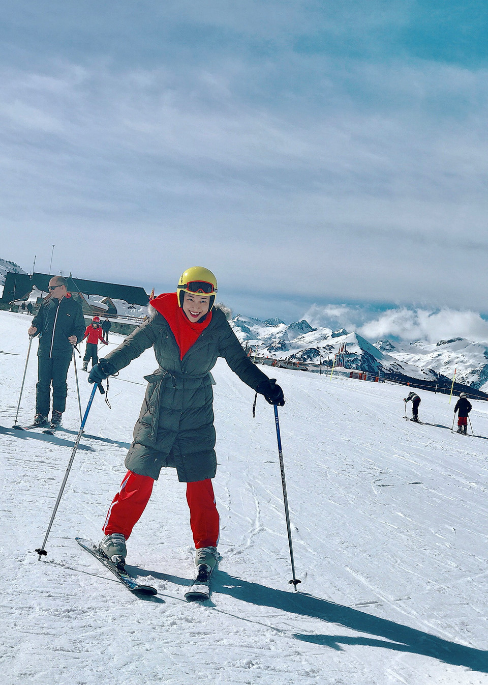 Một trong những trải nghiệm thú vị nhất của Hoàng Oanh khi đến đây là được trượt tuyết ở vùng Val d’Aran. Val d’Aran là vùng núi tuyết thuộc Tây Ban Nha ngay sát biên giới nước Pháp. Cảnh sắc nơi đây hệt như những bộ phim với khu rừng tuyết trắng phủ đầy, ngàn thông lấp lánh ánh mặt trời và thiên nhiên hùng vĩ.