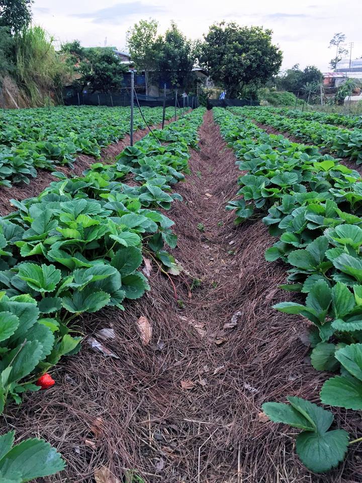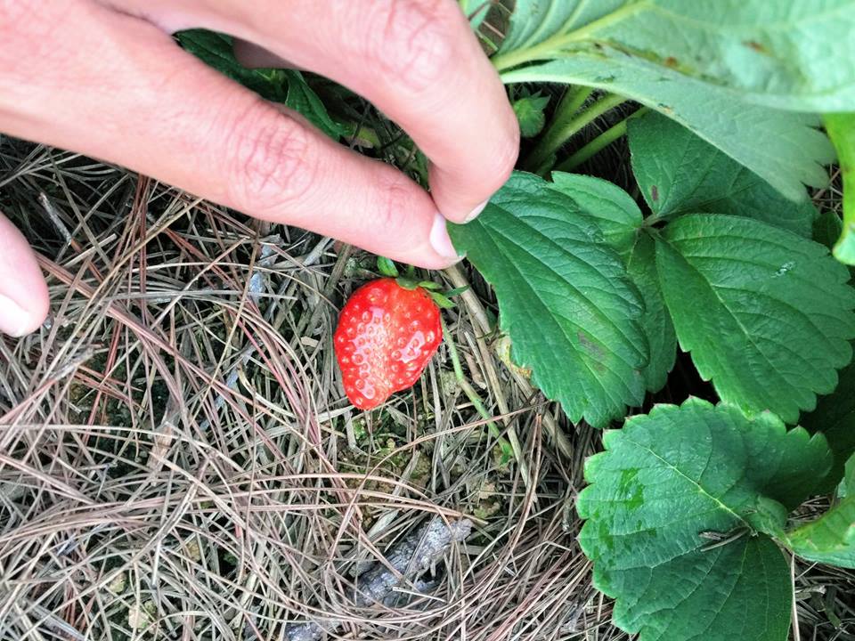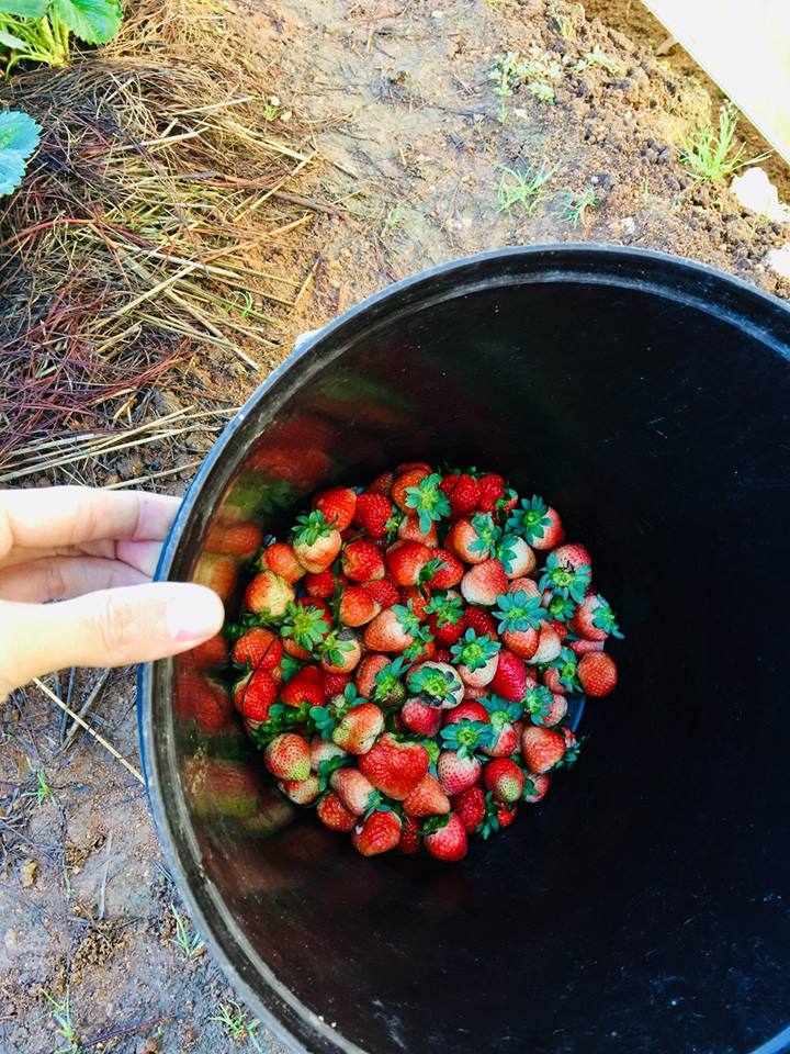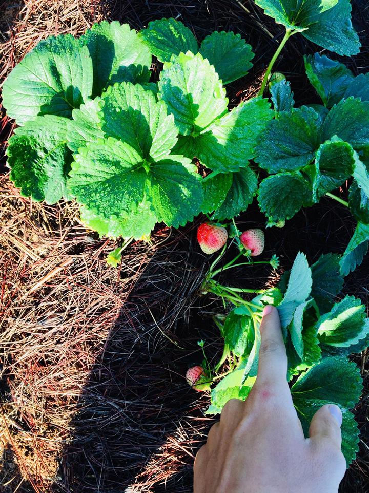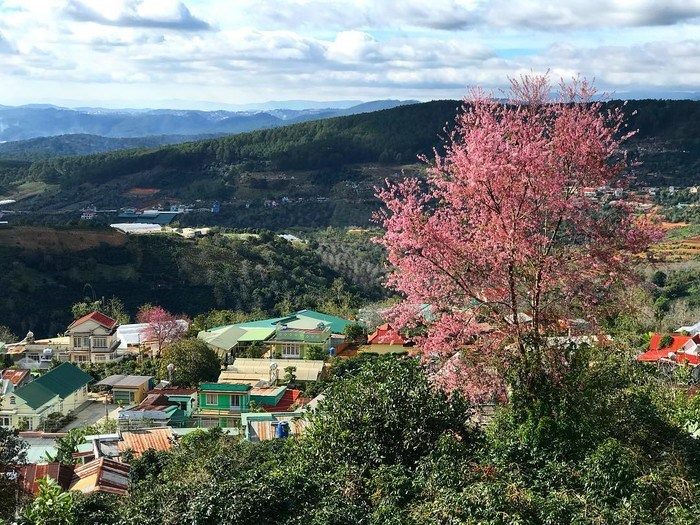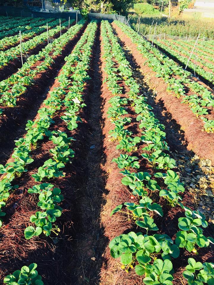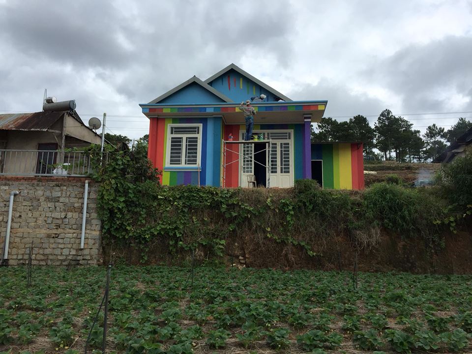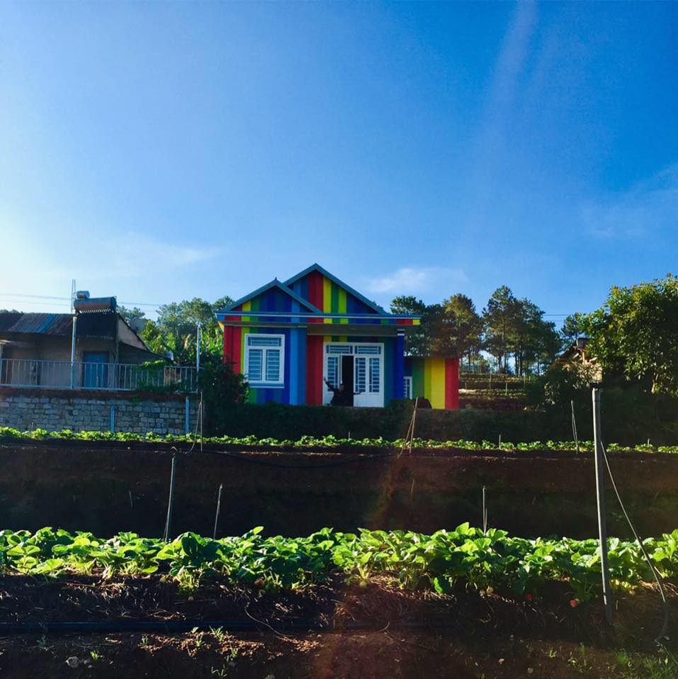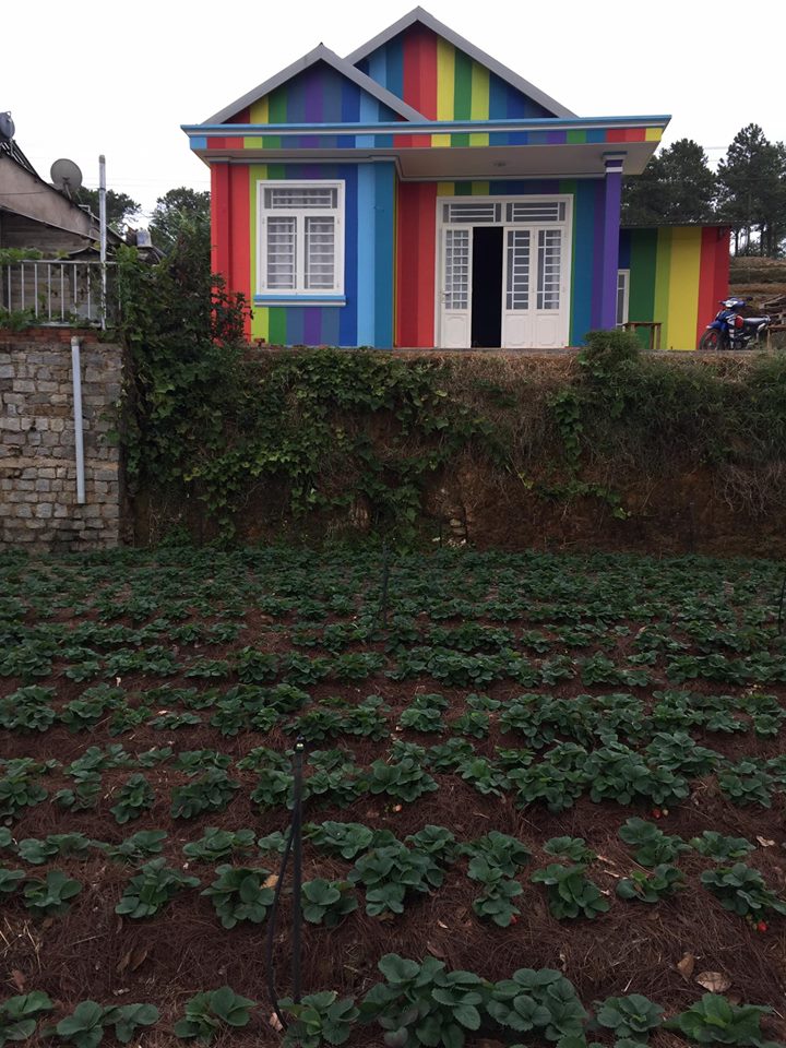 Đi kèm bài viết là bức ảnh ngôi nhà xinh xắn trên sườn đồi được sơn đủ sắc màu, nhưng nhìn không quá rối mắt. Trước nhà còn có vườn dâu khá rộng, với những trái dâu đang chớm chín. Khung cảnh trông rất tuyệt vời và đúng chất Đà Lạt.