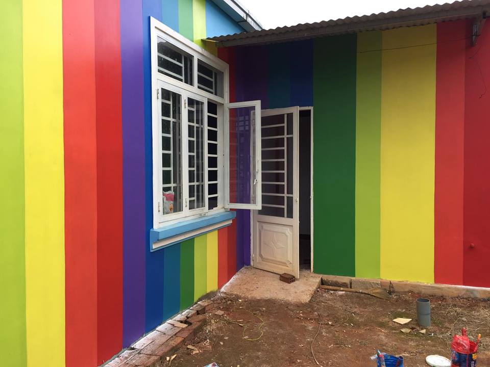 Thật ra là lúc sơn chỉ tính sơn 1 màu thôi, nhưng tự nhiên mình muốn nhà mình dễ nhìn, cũng là làm mốc cho những nhà bên cạnh khi ai muốn tìm nhà, bởi ở đây không có số nhà. À mà sơn lâu và cực lắm… Ai có lên Đà Lạt thì ghé nhà mình chơi nhé”