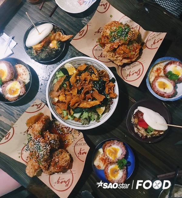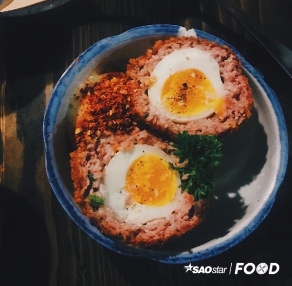 Trứng đúng chuẩn lòng đào, tan chảy đỏ ửng bên trong rất hấp dẫn. Bên ngoài ướm một lớp thịt xay nhuyễn được chiên xù lên giòn rụm và thơm phức. Sự giao hoà ăn ý của trứng béo mịn cùng bột thịt nêm nếm vừa miệng, đấy là lí do tại sao món này vẫn luôn được xem là signature của quán. Bên cạnh đó vẫn còn cánh gà mật ong, salad rong biển để mở đầu cho bữa ăn của bạn.
