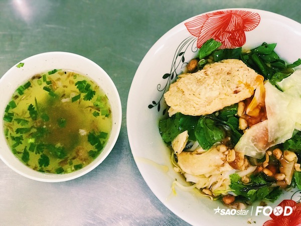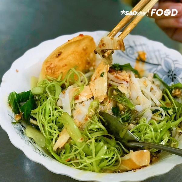 Dùng đũa khám phá, bạn sẽ thấy tô phở gồm ba tầng hương vị. Bên dưới cùng là lớp rau muống và một chút giá, dưa leo giòn tươi. Lớp bánh phở trắng nõn ở giữa và chan hoà bên trên nào là thịt gà, đồ lòng, xá xíu. Để thức ăn thấm vị, bạn phải trộn đều để nước sốt và các món đi kèm hoà quyện vào nhau. Thế là đã sẵn sàng thưởng thức hương vị độc đáo này rồi.