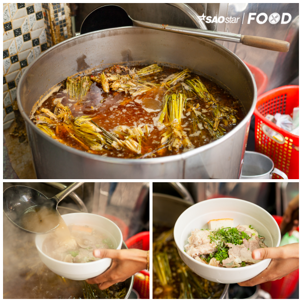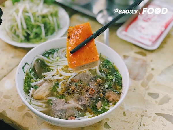 Cái tạo nên nét đặc trưng cho mỗi tô bún ở quán chính là hương vị của nước dùng. Nồi nước lèo đậm đà trong vị ngọt của nước hầm xương và ngào ngạt mùi thơm của các loại thảo dược nấu cùng như quế, hành tây, sả,… Tuy nhiên, chúng không át đi hương vị của món mà chỉ thoang thoảng hương lôi cuốn vị giác vô cùng. Để có nồi nước lèo cho mỗi ngày bán, quán phải hầm xương từ đêm hôm trước trong 12 giờ đồng hồ mới chắt lọc được cái ngọt thanh và sau đó nêm nếm theo bí quyết riêng của quán.
