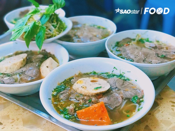 Thịt bò ở quán dùng được cô chủ mỗi sớm lấy từ chợ đầu mối, là loại thịt nguyên chất của bò ta. Tuỳ sở thích mà bạn có thể gọi thịt bắp bò, nạm, tái hay gân. Chưa dùng lại ở đó, tô bún còn kèm thêm cái gion giòn của miếng chả cua, thịt giò béo ngậy hay miếng chả quế đặc trưng.