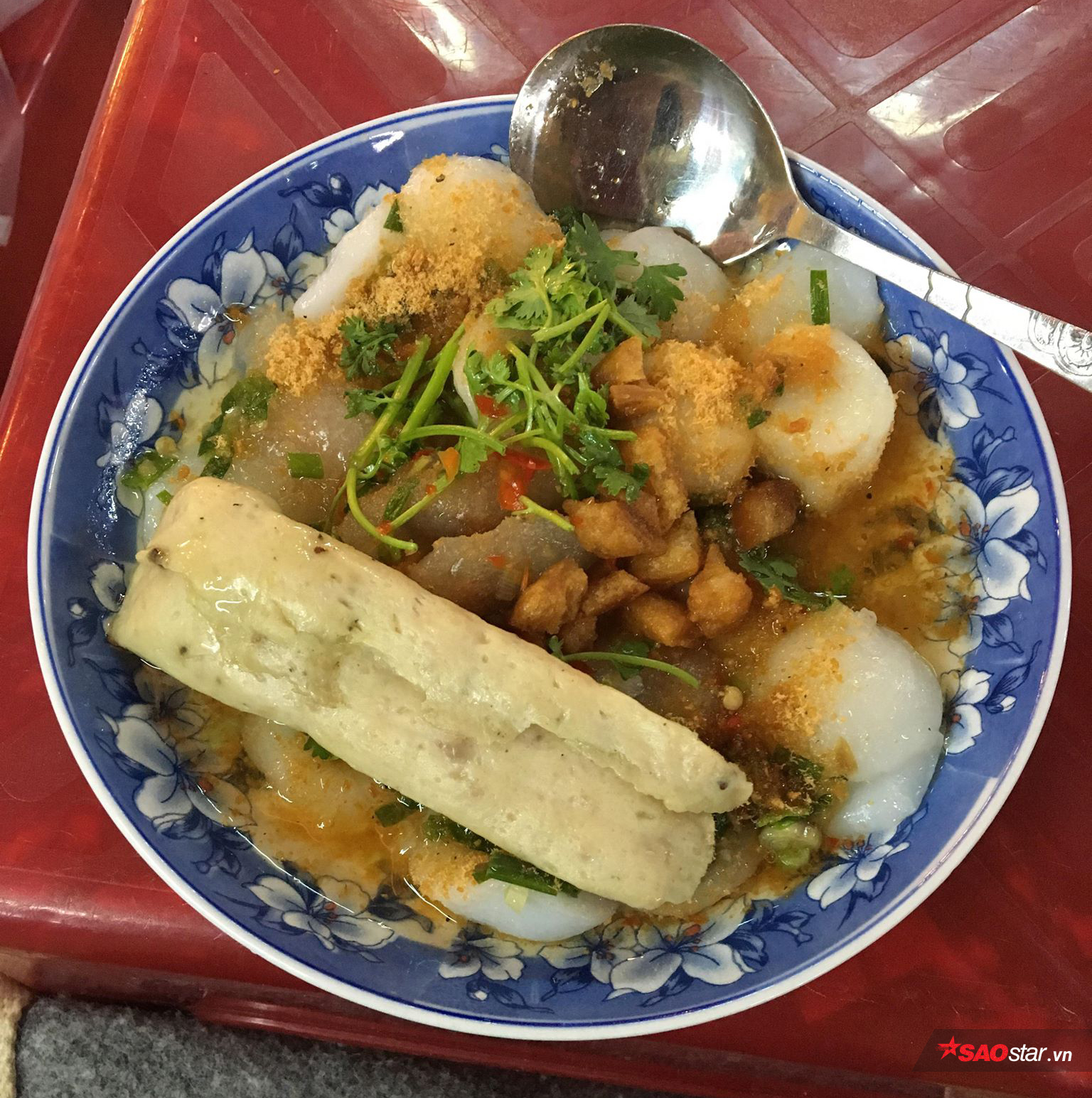 Một dĩa bánh đầy đủ gồm có bánh bèo, bánh bột lọc bánh ít trần và 1 cây chả. Mọi thứ được xếp đầy đặn lên 1 chiếc dĩa sâu lòng, sau đó, cô chủ sẽ phủ lên mặt chút tôm giã mịn, chút hành lá phi, ít bánh mì vụn chiên giòn rôm rốp và kết thúc bằng 1 giá nước mắm đặc sắc chan đều lên dĩa bánh.