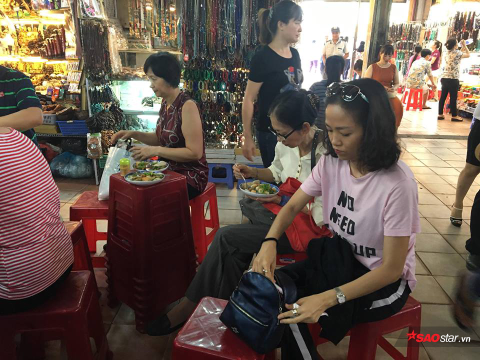 Khi hết chỗ ngồi trên quầy, thực khách cũng không ngần ngại láy ghế làm bàn để thưởng thức món ăn.