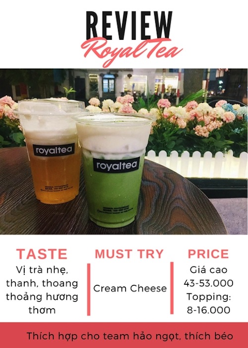 Trà nổi bật của Royal Tea là Trà Hoàng Gia, sự kết hợp của lá trà xanh, trà đen, hoa hồng và hoa đào nên chất trà không đậm mà thanh nhẹ thoảng hương. Món được gọi nhiều nhất chính là lớp kem cheese, có thể sánh ngang với đối thủ “gạo cội” Gongcha.
