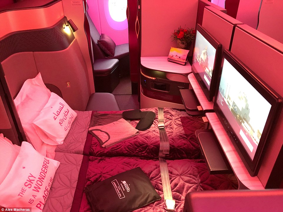 Giường đôi được hình thành bằng cách xếp hai chiếc ghế giữa thành giường bằng phẳng. Tại đó có cả vách ngăn tạo thành một phòng ngủ riêng với hai màn hình giải trí bên trong.