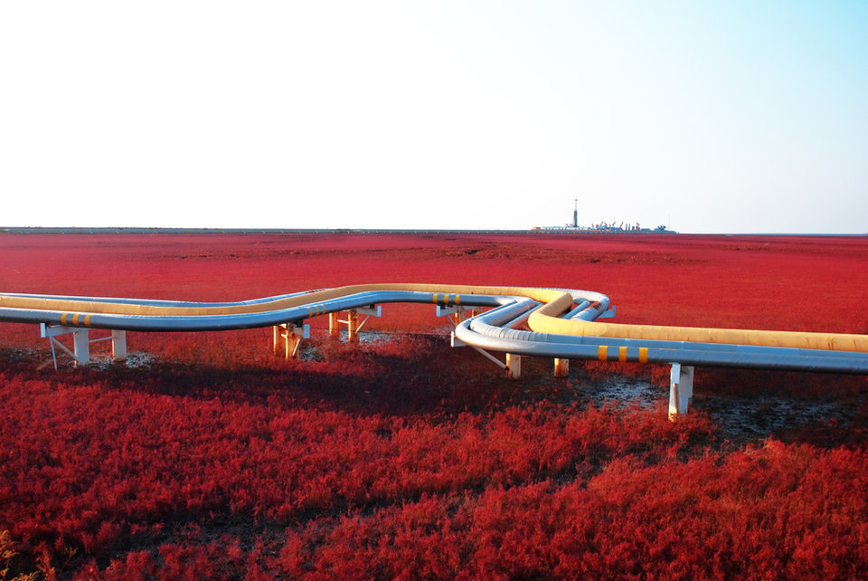 Biển Đỏ ở Trung Quốc được bao phủ bởi loài tảo có tên gọi là Sueda, tạo nên một cảnh tượng rực rỡ hiếm thấy vào mùa thu.