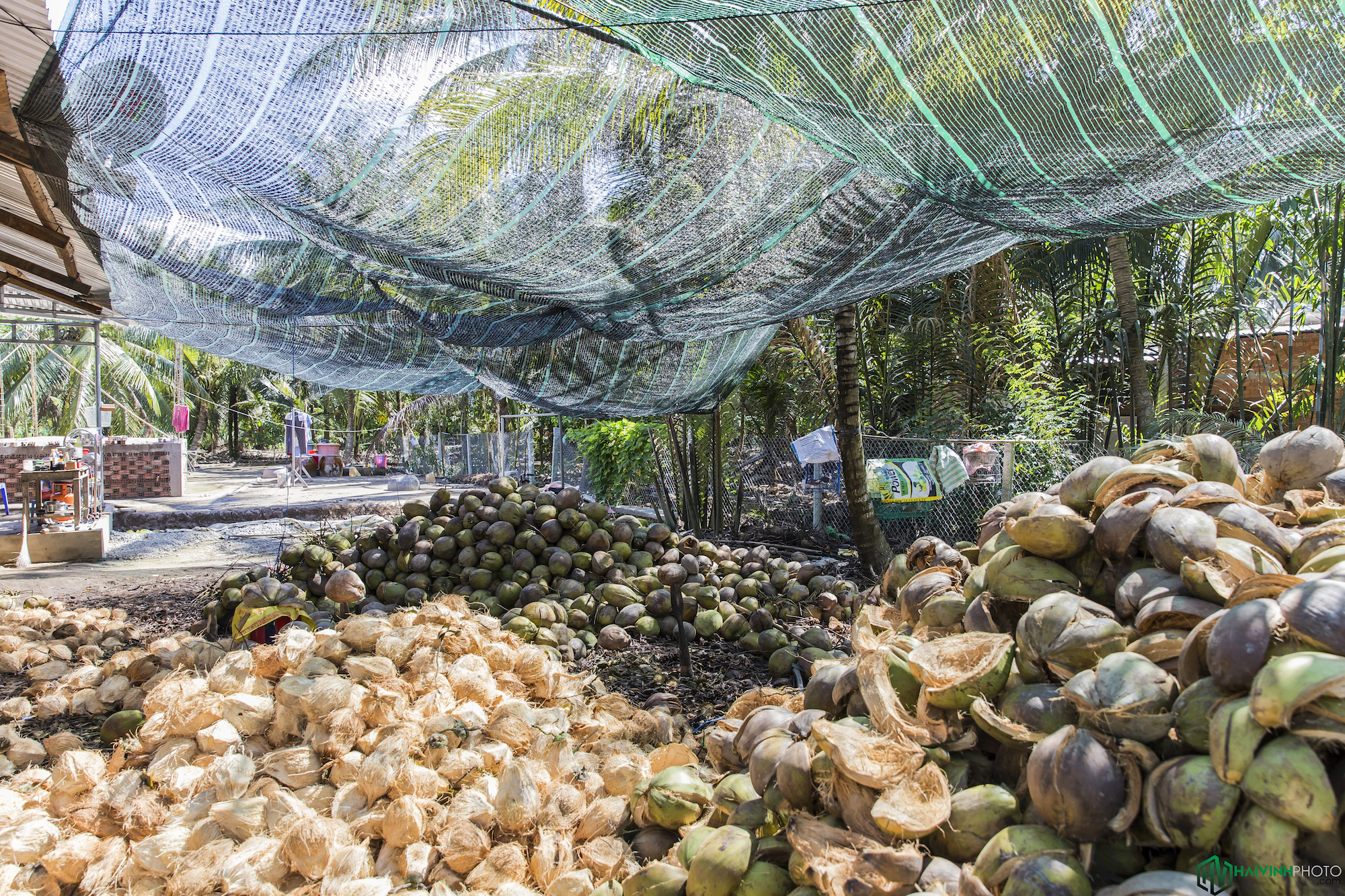 Bến Tre nổi tiếng nhất chính là dừa, dừa bạt ngàn với hàng trăm ngàn ha, trong ảnh là một bãi dừa chuẩn bị lột vỏ.