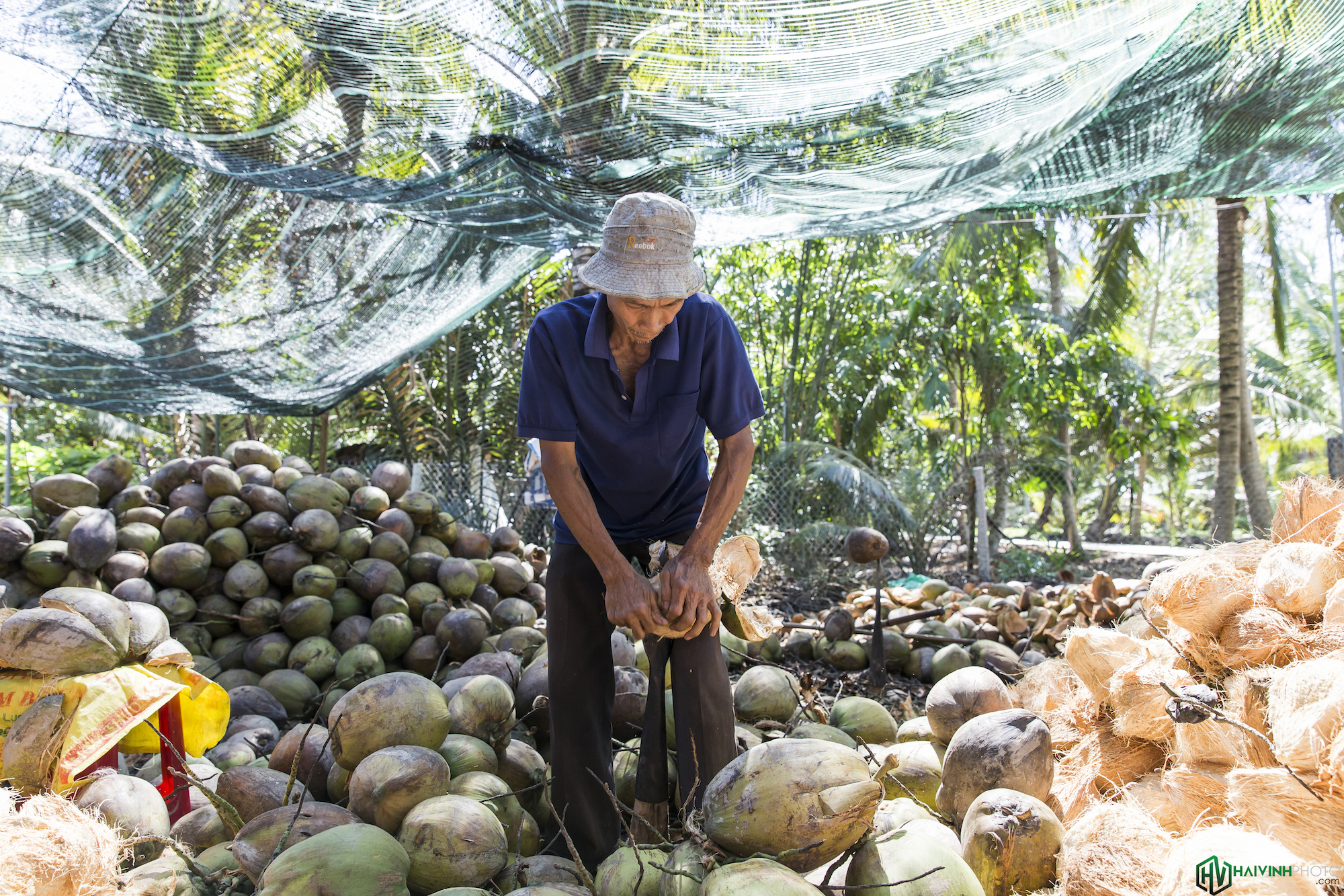 Một chú lớn tuổi đang lột vỏ dừa, trông vậy chứ không đơn giản chút nào, đòi hỏi sự khéo léo và kinh nghiệm, sơ sẩy chút là có thể bị thương tích bởi cây chĩa phía dưới rất nhọn và sắc.