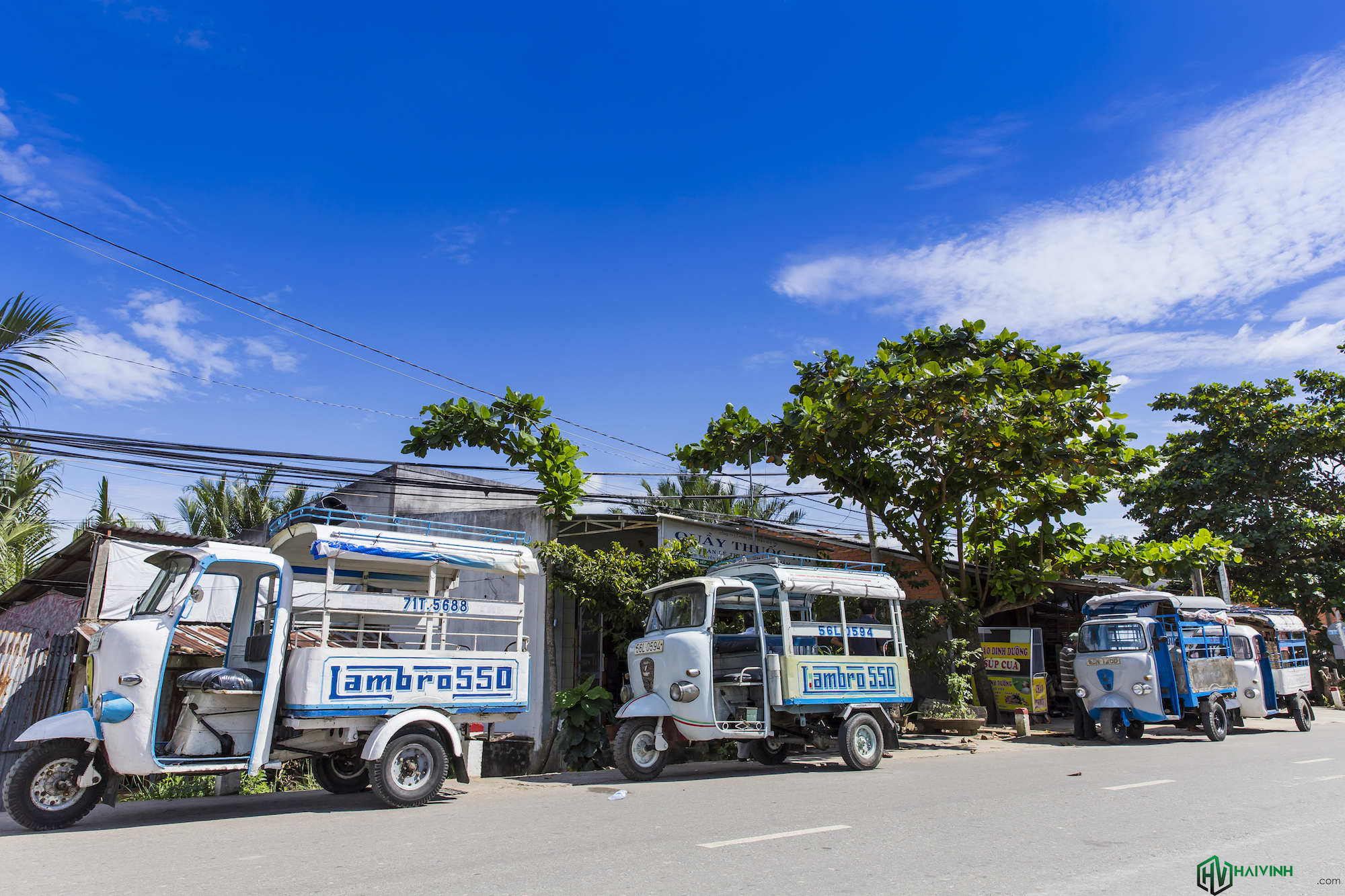 Xe lam vẫn là phương tiện vận chuyển công cộng rất phổ biến trên các cù lao do đường ở đây nhỏ hẹp. Xe được cải tạo sơn mới rất đẹp. Nguyên đoàn xe lam đưa chúng tôi đến với cơ sở sản xuất chổi đót truyền thống, nghề đặc trưng của người dân nơi đây.