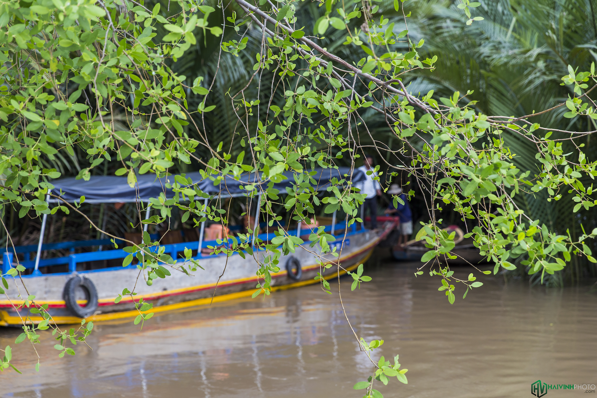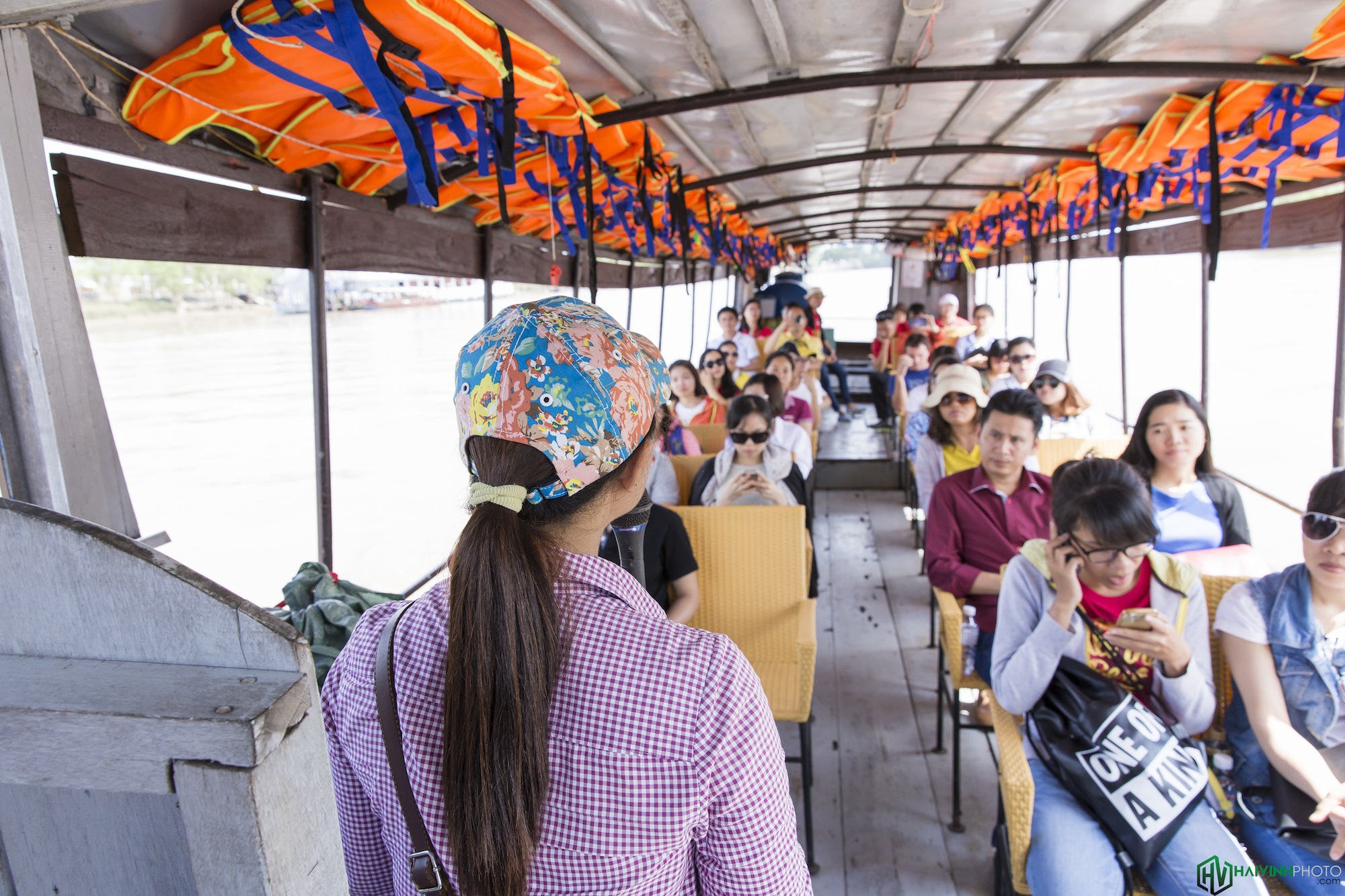 Sau gần 2 tiếng di chuyển, chúng tôi cũng đến được bến thuyền. Cả đoàn nhanh chóng xuống thuyền và bị cuốn hút bởi giọng thuyết minh ngọt ngào, nhẹ nhàng của chị hướng dẫn viên. Hai bên thuyền gió từ sông Hàm Luông thổi vào mát rượi, xua tan cái nóng đầu ngày.