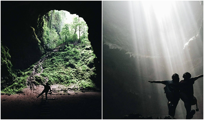 Hang Goa Jomblang là một hang đá kỳ lạ. Sau hàng nghìn năm của các quá trình kiến tạo, vùng lân cận tạo thành một hố chìm. Nếu là một du khách ưa mạo hiểm, bạn sẽ được tận hưởng quá trình “hạ cánh” 60 mét xuống hang động này. Ở dưới cùng của hang động, bạn sẽ bước vào một khu rừng cổ xinh đẹp dày đặc hệ thực vật như rêu, dương xỉ. Đi bộ thêm 300 m nữa là rìa của Goa Grubug - một hố chìm tuyệt đẹp có hiện tượng tự nhiên được gọi là “Ánh Sáng của Thiên Đàng”!
