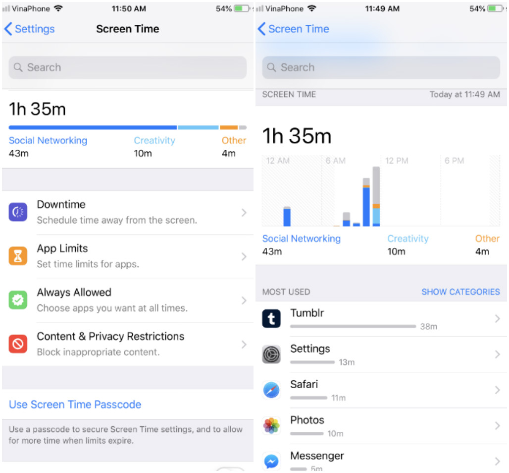 Trên iOS 12, người dùng sẽ biết được tần suất sử dụng điện thoại của mình là như thế nào với ứng dụng Screen Time. Ứng dụng nàỳ sẽ cho bạn biết được rằng mình đang lãng phí nhiều thời gian vào ứng dụng nào và ứng dụng nào gửi cho bạn nhiều thông báo nhất. Ngoài ra, Screen Time còn có một Widget hiển thị thời gian sử dụng điện thoại ở màn hình phụ.