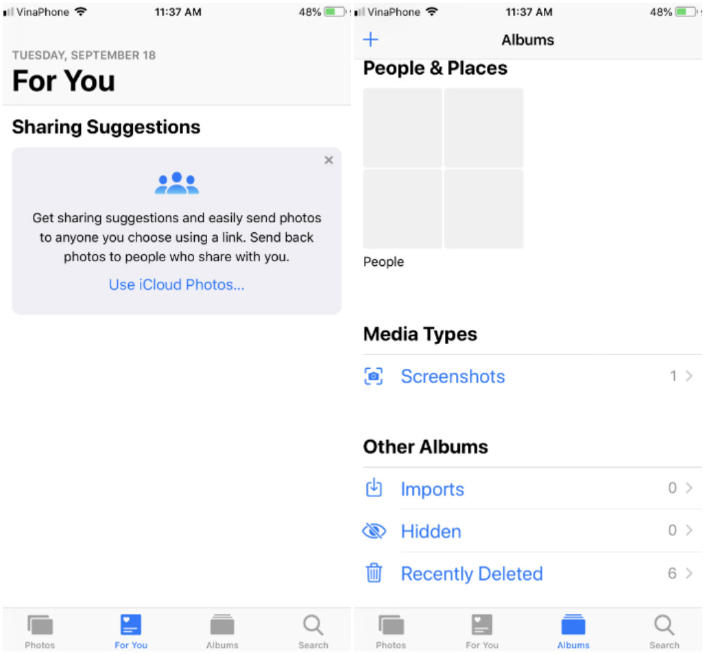Trên iOS 12, ứng dụng Photos sẽ có thêm một thanh “For You”, nhằm giúp người dùng tìm kiếm dễ dàng những hình ảnh được chụp ở nhiều năm trước. Giao diện ứng dụng cũng hỗ trợ bạn tìm kiếm người, địa điểm,… nhờ vào AI (trí tuệ nhân tạo).
