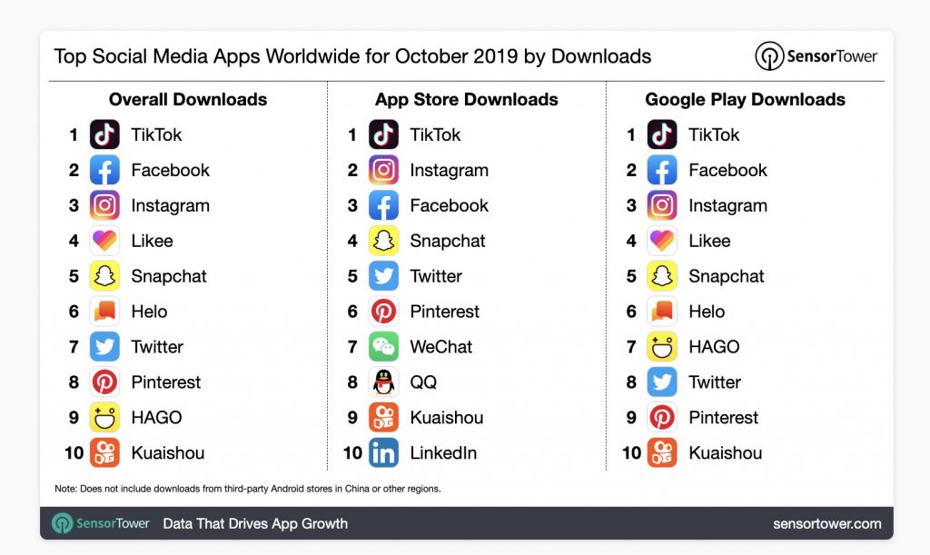 Ứng dụng video ngắn TikTok (ByteDance) và ứng dụng chia sẻ video Helo, cùng Likee (YY) và Kuaishou (ứng dụng được Tencent chống lưng) đều nằm trong danh sách top 10 ứng dụng mạng xã hội được tải về nhiều nhất trong tháng 10 trên phạm vi toàn cầu, theo một thống kê của SensorTower.