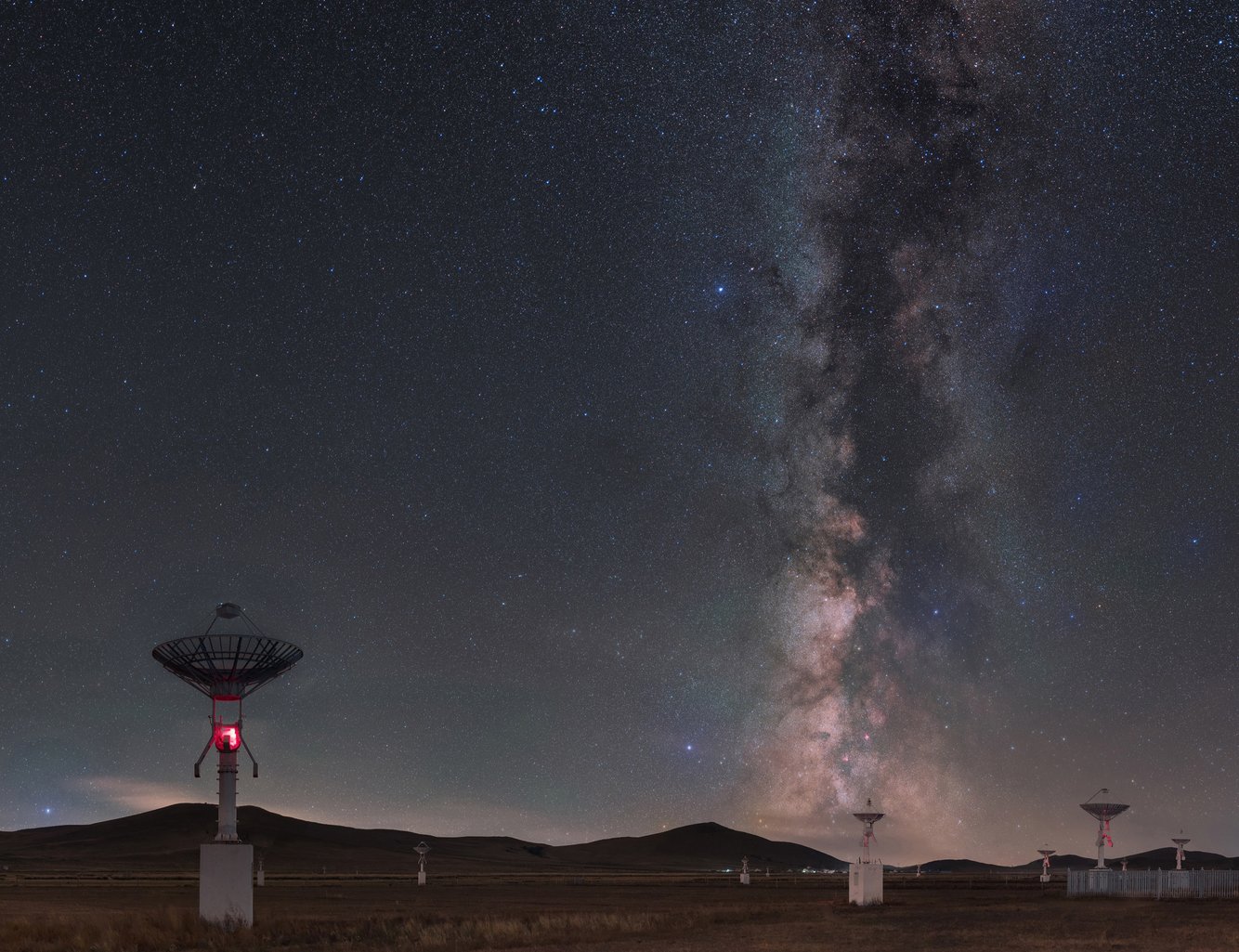 Những chiếc đĩa radio được thiết kế để nghiên cứu mặt trời như đang “nhìn lên” dải ngân hà trong hình ảnh ấn tượng này.