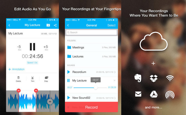 Voice Memos của Apple không tệ nhưng nó không mang đến cho người dùng cách tốt để sắp xếp hay ghi chú các đoạn ghi âm. Trong khi đó, Recordium cho phép bạn biên tập đoạn ghi âm ngay trong ứng dụng và ghi chú ở bất kì phần nào của đoạn ghi âm. Nó cũng hỗ trợ đồng bộ thông tin lên điện toán đám mây với các dịch vụ như Google Drive hay Dropbox.