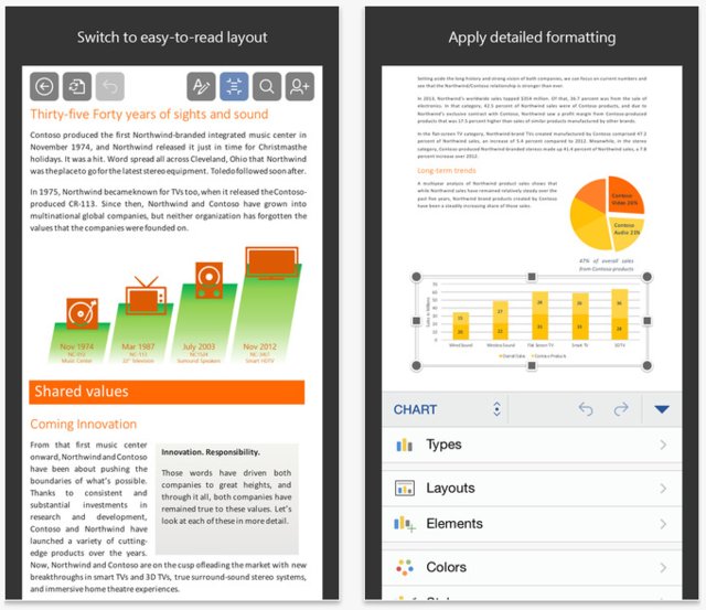 Ứng dụng Pages của Apple có khá nhiều công cụ hữu ích, tuy nhiên trên một thiết bị màn hình nhỏ như iPhone thì đôi khi bạn sẽ cảm thấy khá khó đọc hay định dạng văn bản. Microsoft trong khi đó khi phát triển Word đã làm rất tốt việc phát triển chế độ hiển thị dễ đọc trên di động so với thể thức thực tế của văn bản. Ứng dụng này cũng được đánh giá cao hơn khi người dùng soạn thảo hay định dạng văn bản trên điện thoại.