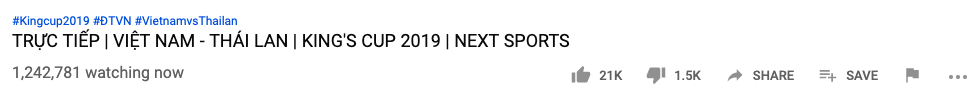 Dù vậy, cũng không khó hiểu khi Next Media quyết định mua bản quyền phát sóng King's Cup 2019. Mặc dù ở thời điểm hiện tại những thống kê về tỷ lệ người xem trận đấu giữa Thái Lan và Việt Nam trên truyền hình (rating) vẫn chưa được công bố, con số người xem trực tiếp trận đấu này trên YouTube đủ để chứng minh sức hút của đội tuyển Việt Nam. Cụ thể, có những thời điểm kênh YouTube của Next Media đón nhận tới 1,3 triệu người xem trực tiếp trận đấu nói trên cùng lúc.