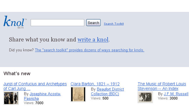 Knol là cách đáp trả của Google với Wikipedia. Knol theo đó là một thuật ngữ được Google tạo ra với ý nghĩa là “đơn vị tri thức”. Với mục tiêu trở thành nơi người dùng chia sẻ các bài viết về nhiều lĩnh vực, Knol rất tiếc lại không có số lượng người dùng đủ lớn và đóng cửa năm 2012.