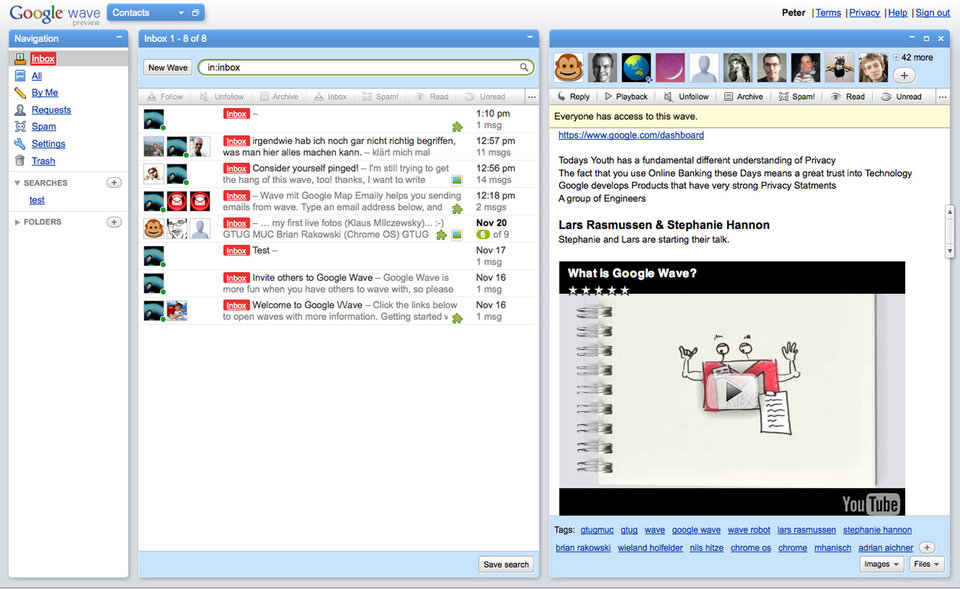 Được tạo ra bởi những người đã phát triển Google Maps, Goolgle Wave có một mục tiêu tham vọng là tái định hình email với nhiều tính năng cho phép làm việc nhóm trên các tài liệu. Thế nhưng, người dùng nhanh chóng cảm thấy Wave quá khó sử dụng và Google dừng phát triển thêm ứng dụng này vào năm 2010. Đến năm 2012, Wave chính thức đóng cửa.