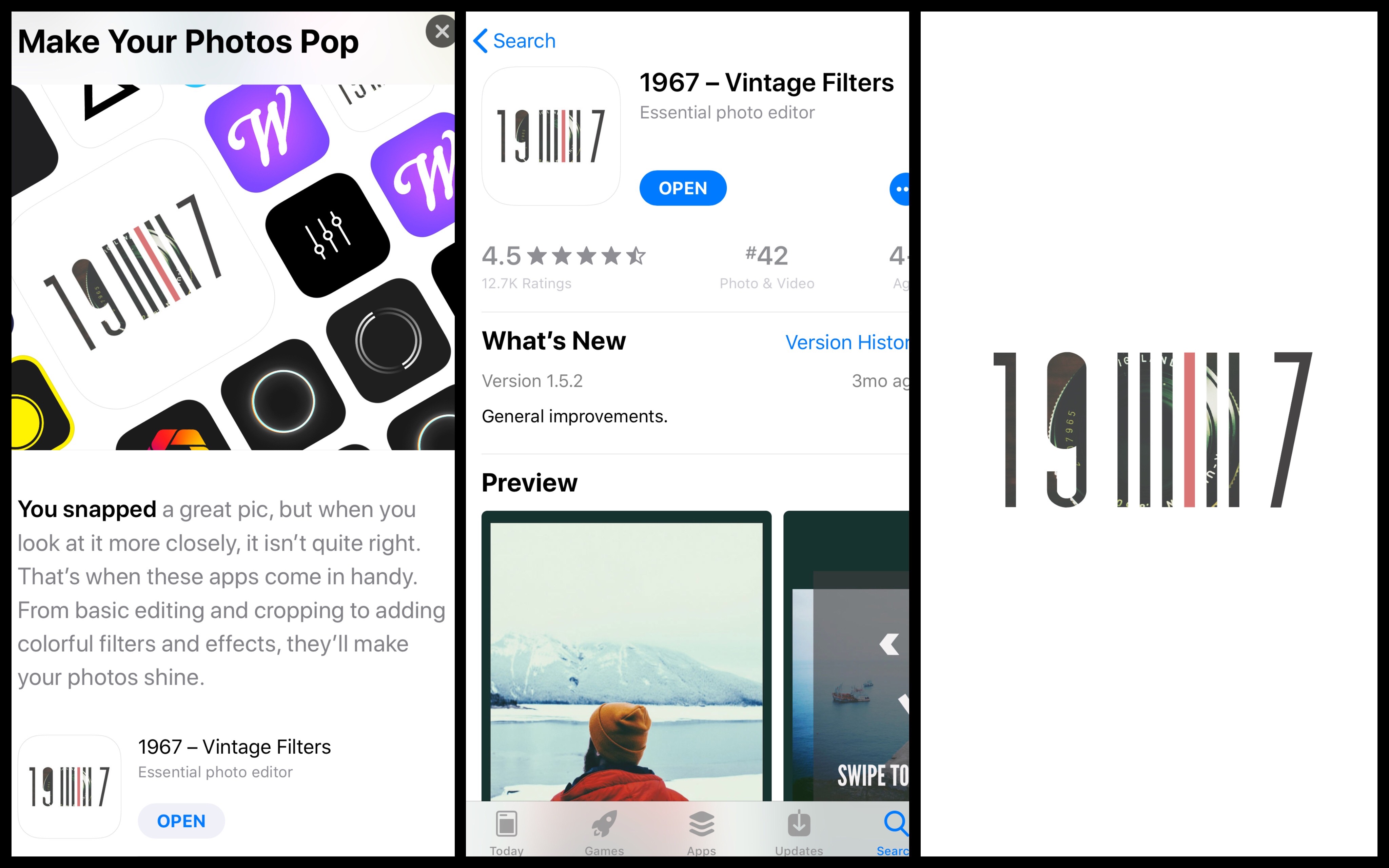1967 - Vintage Filters là ứng dụng hoàn toàn miễn phí có trên nền tảng iOS. Ứng dụng sẽ cung cấp cho bạn những công cụ chỉnh ảnh cực kỳ chuyên nghiệp nhưng lại vô cùng đơn giản.