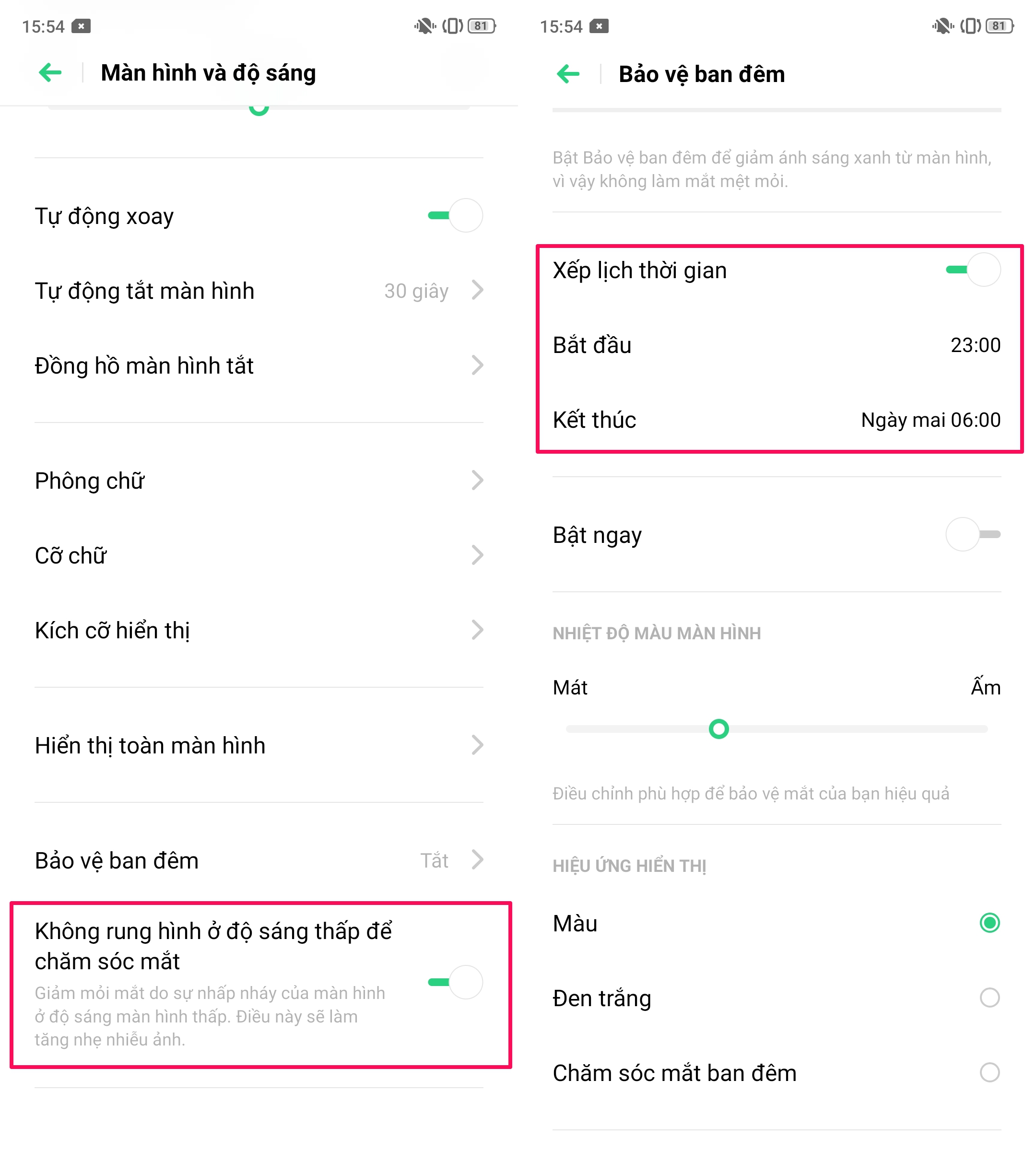 Để bật tùy chọn bảo vệ mắt, bạn truy cập Cài Đặt > Màn hình và độ sáng > bật tùy chọn Không rung hình ở độ sáng thấp để chăm sóc mắt. Ngoài ra bạn nên xếp lịch để máy tự động bật thêm chế độ Bảo Vệ Ban Đêm nhằm giảm lượng ánh sáng xanh gây khó ngủ về đêm. Tùy vào lịch sinh hoạt của bạn mà chọn khung giờ bật tắt phù hợp nhé.