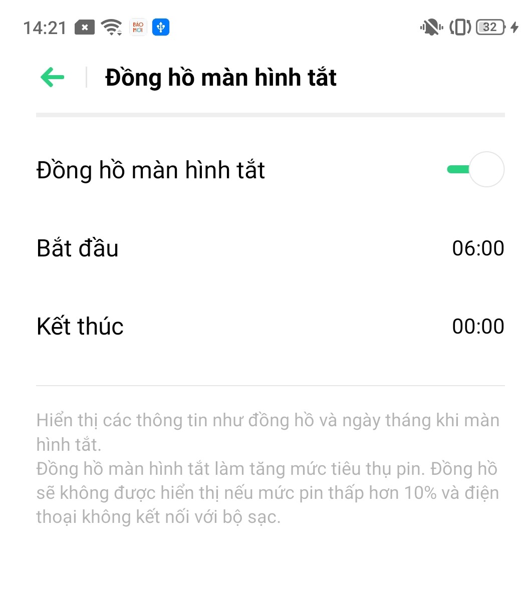 Mặc định tính năng này chưa được kích hoạt. Để bật, bạn vào Cài Đặt > Màn hình và độ sáng > Đồng hồ màn hình tắt. Tại đây ngoài việc bật em nó lên, bạn còn thiết lập thêm khung giờ hoạt động nhằm tiết kiệm năng lượng cho máy khi không dùng đến.