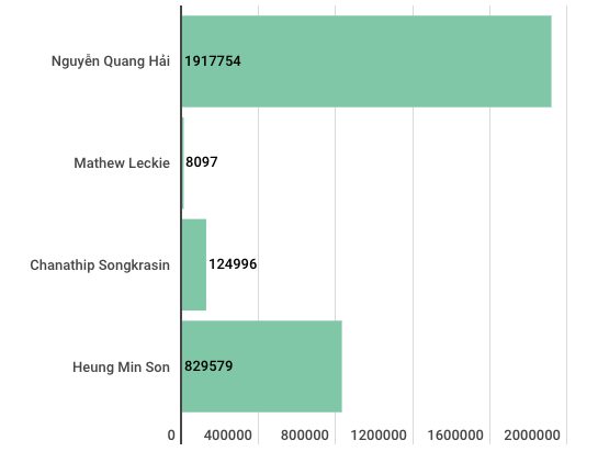 Số lượng người theo dõi hoặc nhấn like trên tài khoản Facebook của một số cầu thủ dáng chú ý nhất Asian Cup 2019.