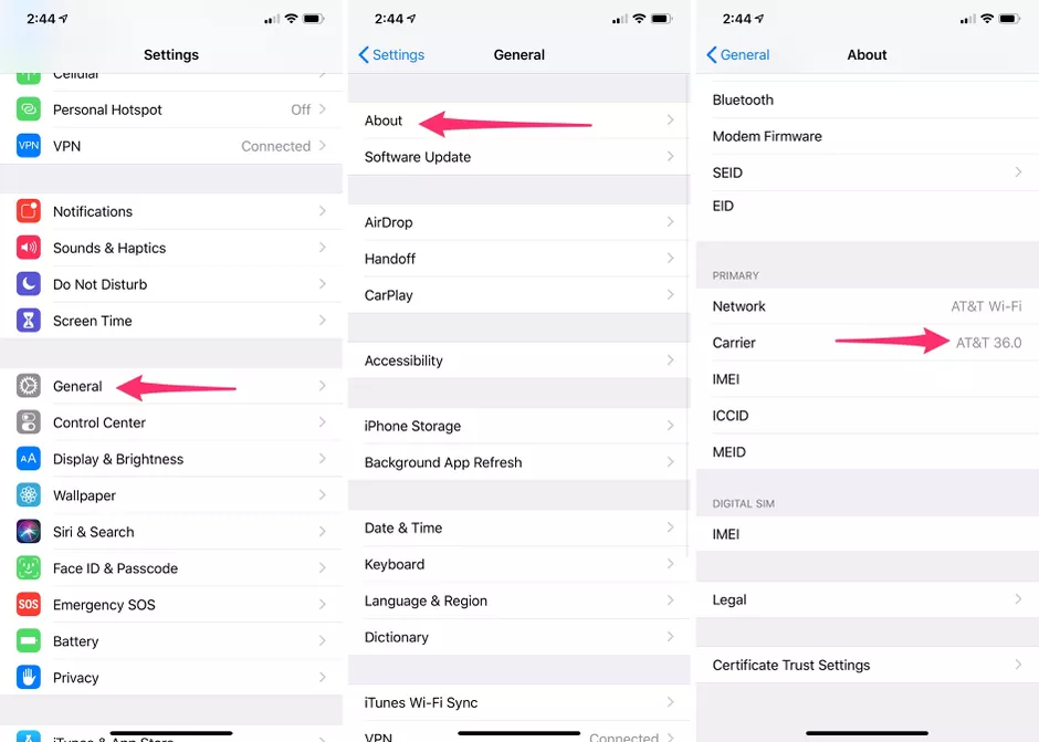 Kiểm tra thiết lập nhà mạng bằng cách vào Settings > General > About. Nếu có cập nhật, bạn sẽ được nhắc để cài đặt. (Ảnh: Cnet)