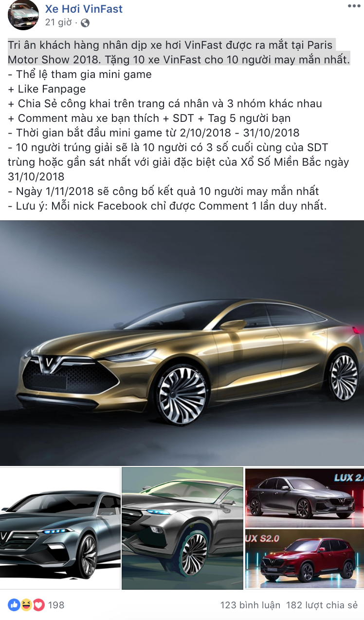 Hình thức câu like này đã quá quen thuộc với các Facebooker vài năm trước, nhưng cho đến thời điểm hiện tại thì vẫn có người dính quả lừa có phần hơi phi lý này. Ban đầu, các Fanpage trên Facebook kêu gọi mọi người chỉ cần “Like page và share rồi comment số” để có cơ hội trúng iPhone, iPad hay thậm chí xe hơi VinFast.