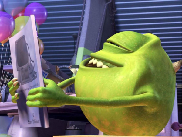 Ở đoạn cuối của phim có một phân cảnh Mike nhận được một tờ báo. Có điều gì đặc biệt về nó? Hãy nhìn trang bìa sau mà xem. Có một dòng chữ là “Scare Different” (tạm dịch: Hãy dọa nạt khác đi), một cách “chơi chữ” với slogan “Think Diffirent” (tạm dịch: Hãy nghĩ khác đi) của Apple.