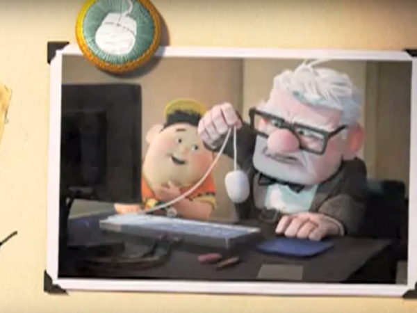 Cũng trong phần credit của phim Up, có một hình ảnh Carl và Russell đang ngồi “nghiên cứu” chuột của máy tính Mac.